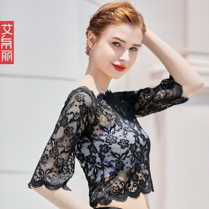 蕾丝打底衫女春款洋气小衫春秋波浪边性感露锁骨一字肩上衣夏新款