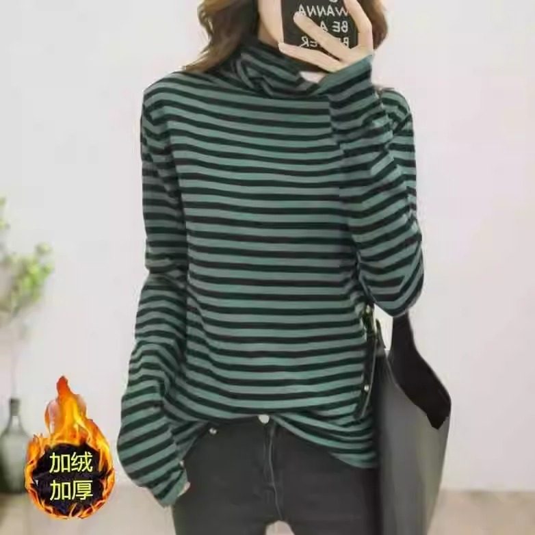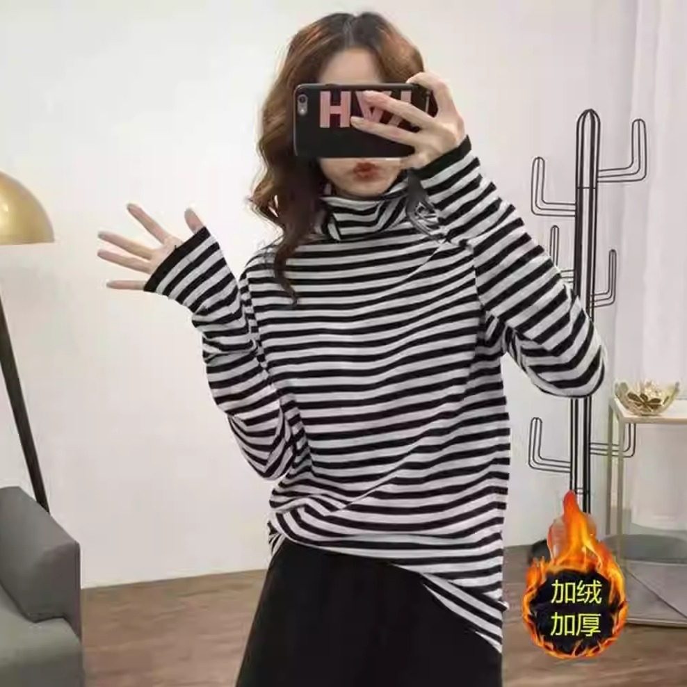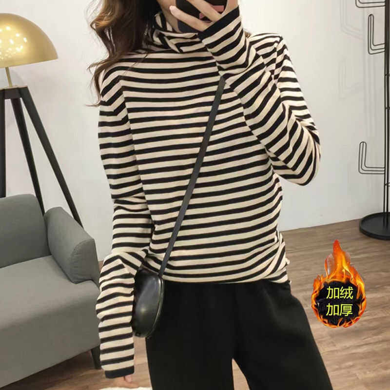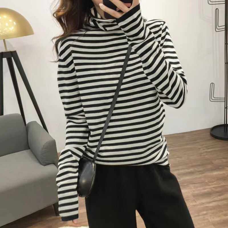 2025新款高领条纹打底衫女装秋冬韩版百搭长袖上衣宽松高级感T恤