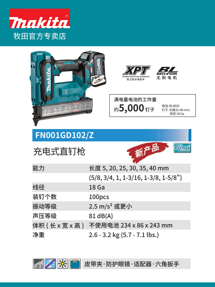 牧田FN001G充电直钉枪40V进口无刷锂电F型木工射钉枪气钉枪打钉器