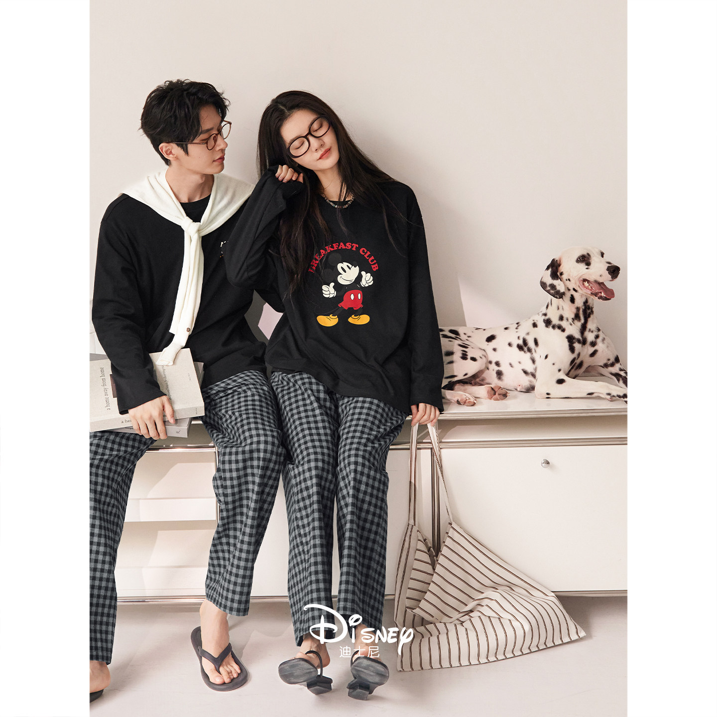 迪士尼情侣睡衣女款春秋季可爱米奇长袖家居服男士大码柔软棉套装