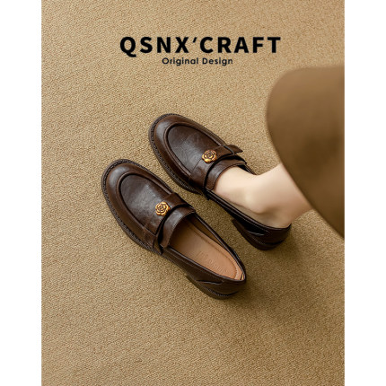 羊皮~棕色山茶花乐福鞋女2025新款通勤粗跟单鞋百搭英伦风小皮鞋