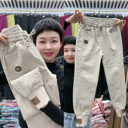 2024欧货春款遮肉米白色水洗棉休闲女裤高腰时尚宽松束脚哈伦裤女