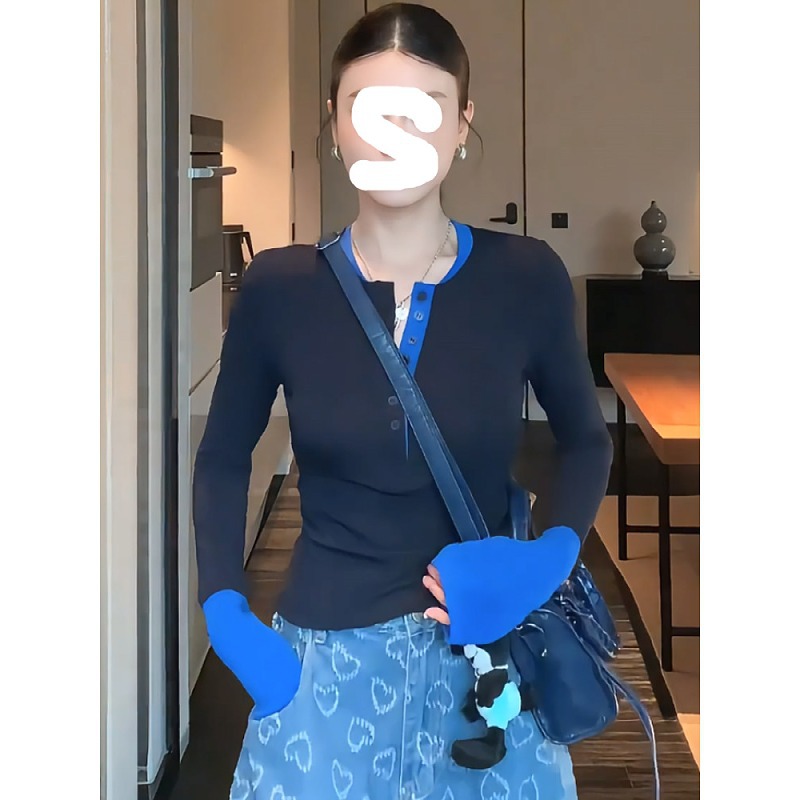 撞色拼接假两件v领长袖t恤女大码胖mm秋季短款修身内搭打底衫上衣