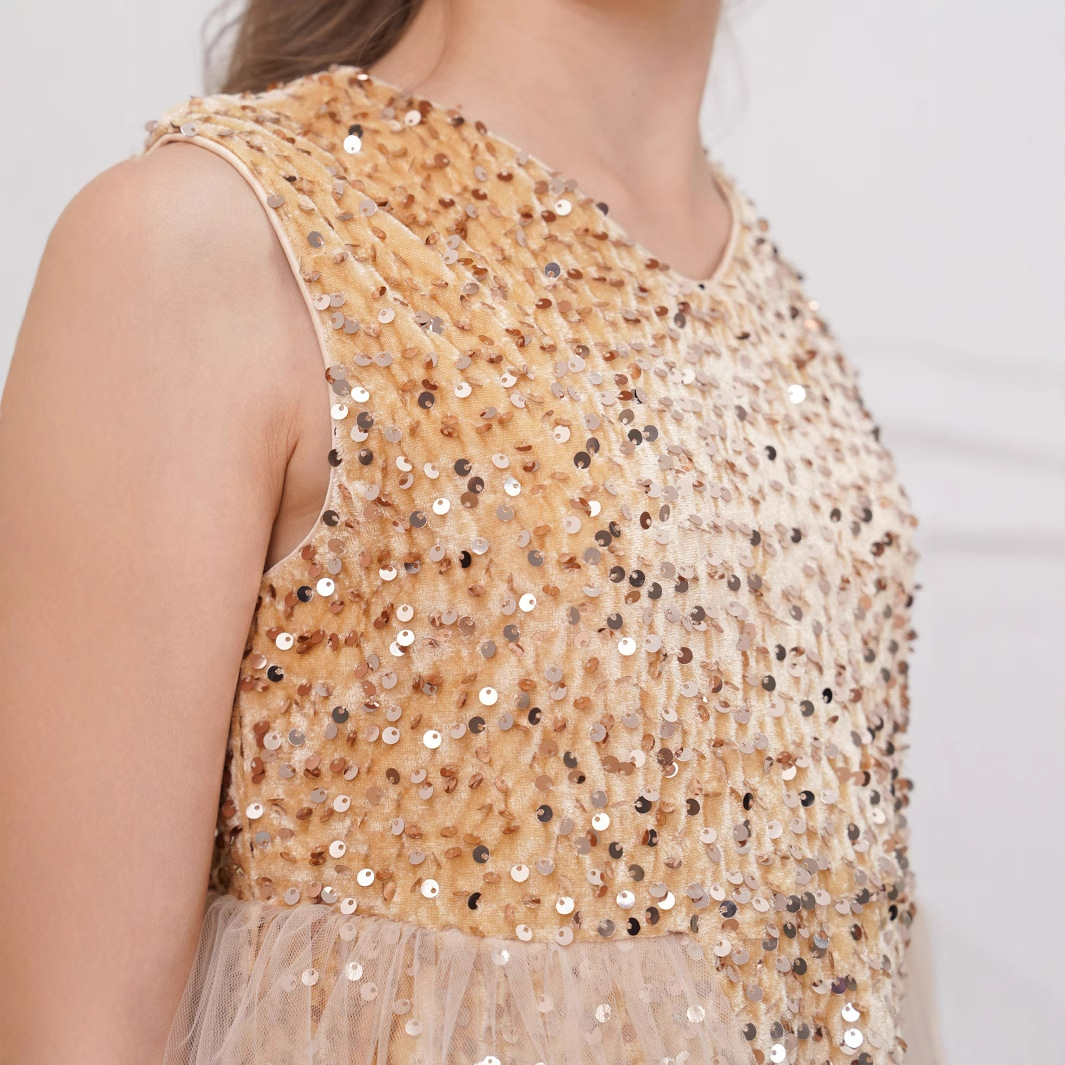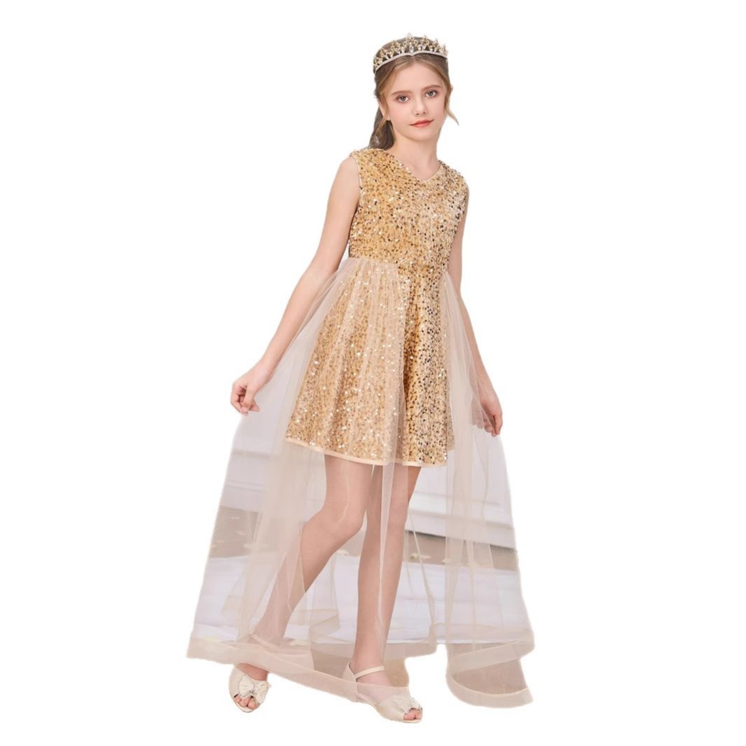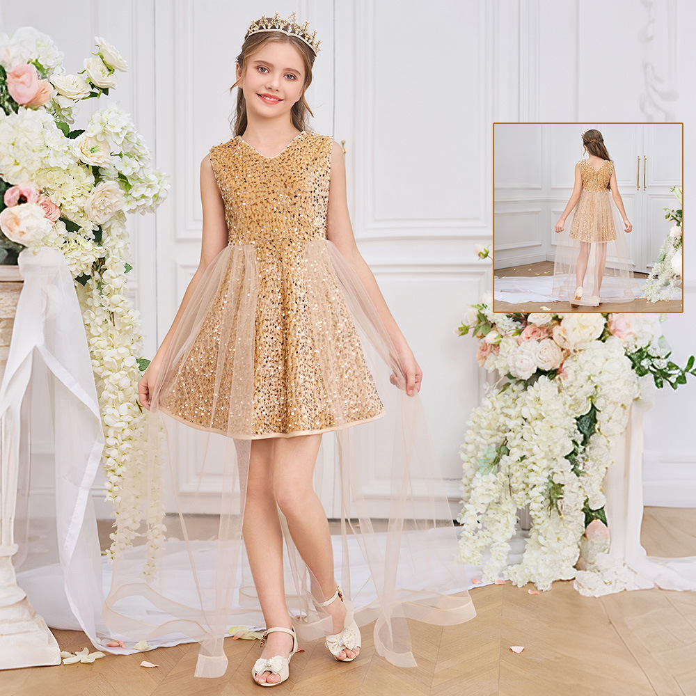 2025跨境花童婚纱亮片礼服裙儿童公主裙网纱长裙女孩走秀款宝宝