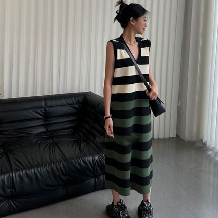 2025夏季新款连衣裙女V领条纹无袖背心美式复古高级感小众t恤长裙