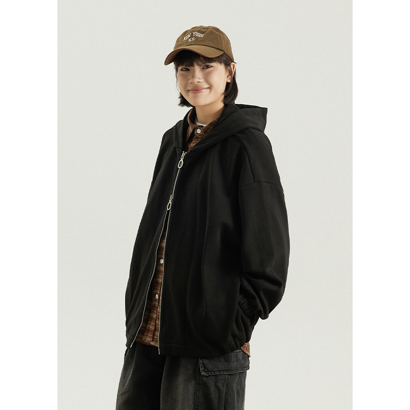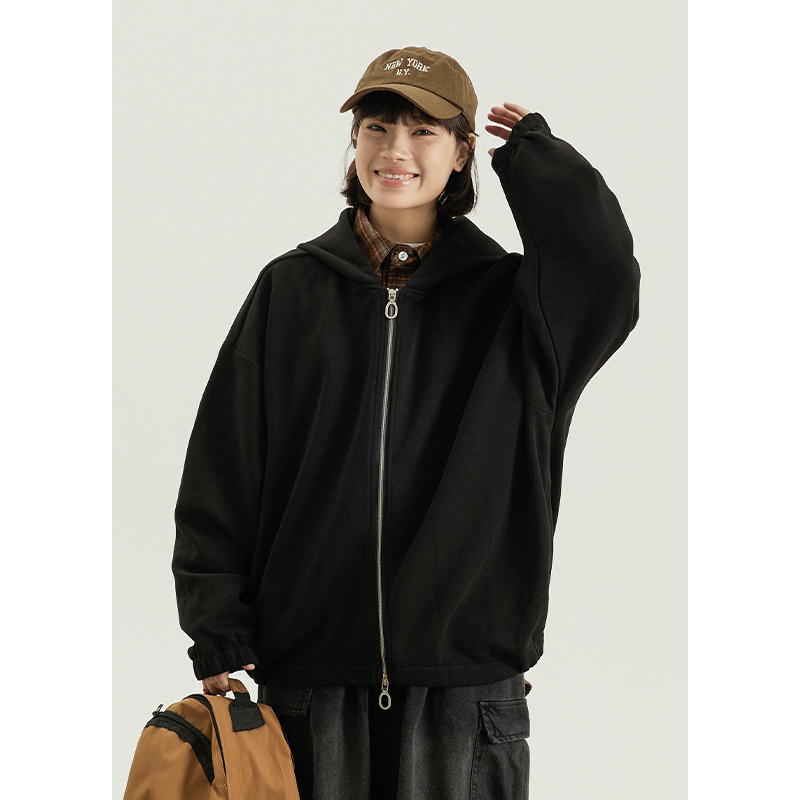 GoodNorth日系复古纯色双拉链连帽卫衣男女同款宽松简约百搭外套