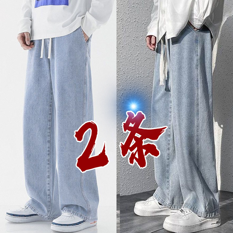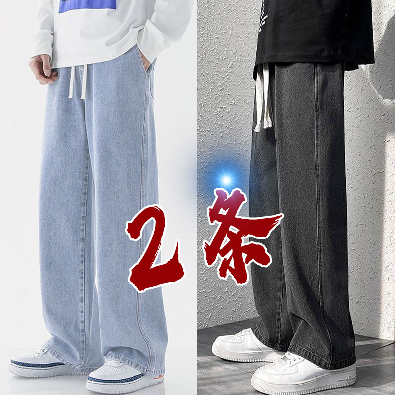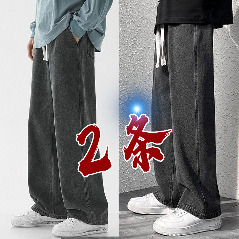 松紧腰牛仔裤男潮牌直筒宽松阔腿长裤男美式复古水洗休闲裤子春秋