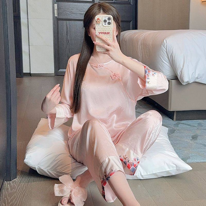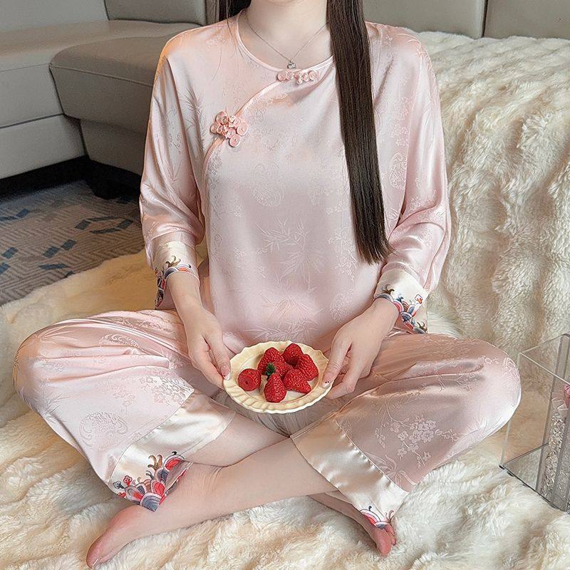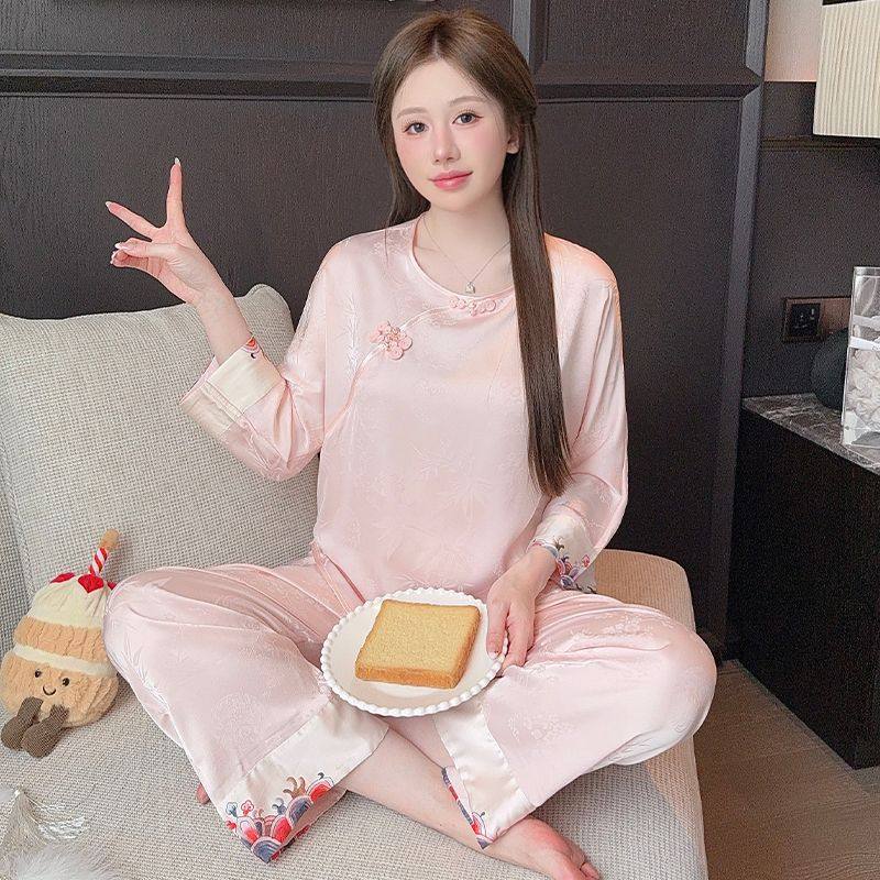 睡衣女2026春季新款冰丝长袖长裤提花新中式国风家居服套装可外穿
