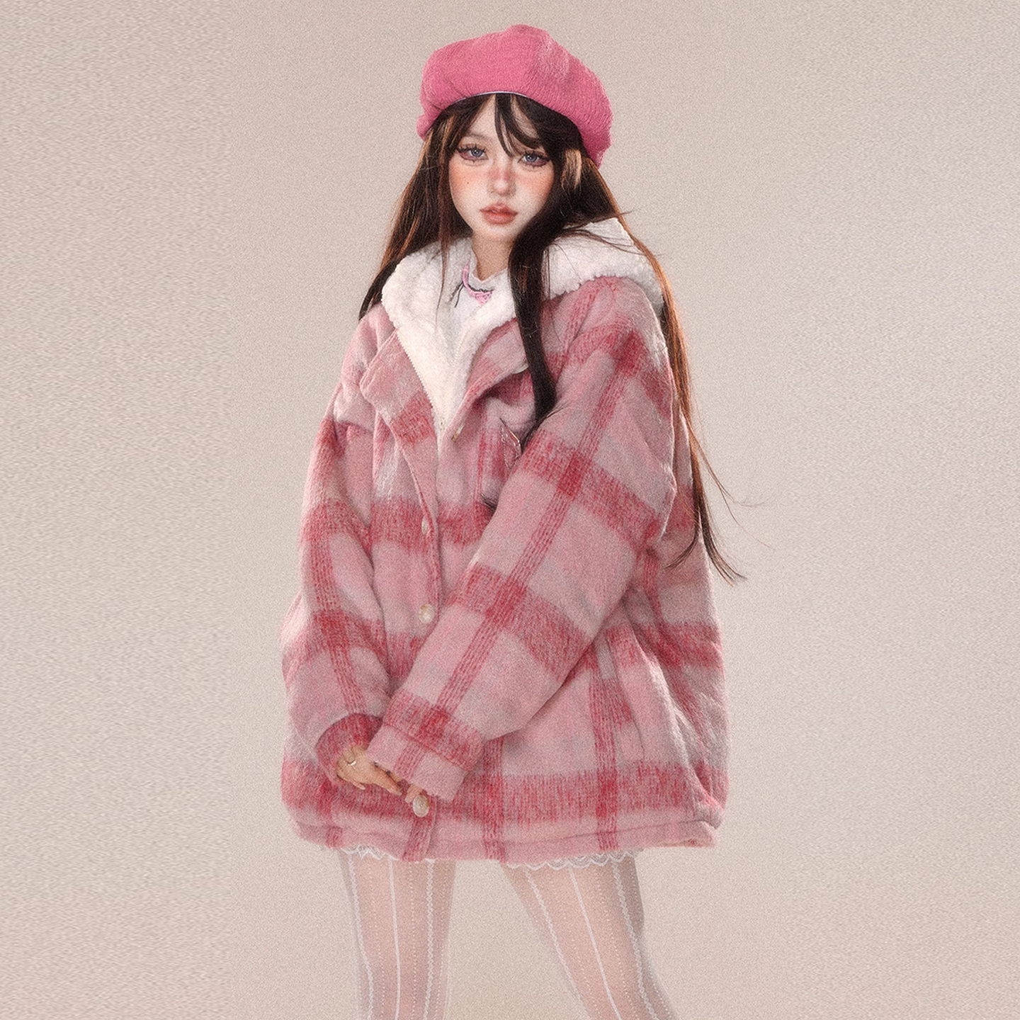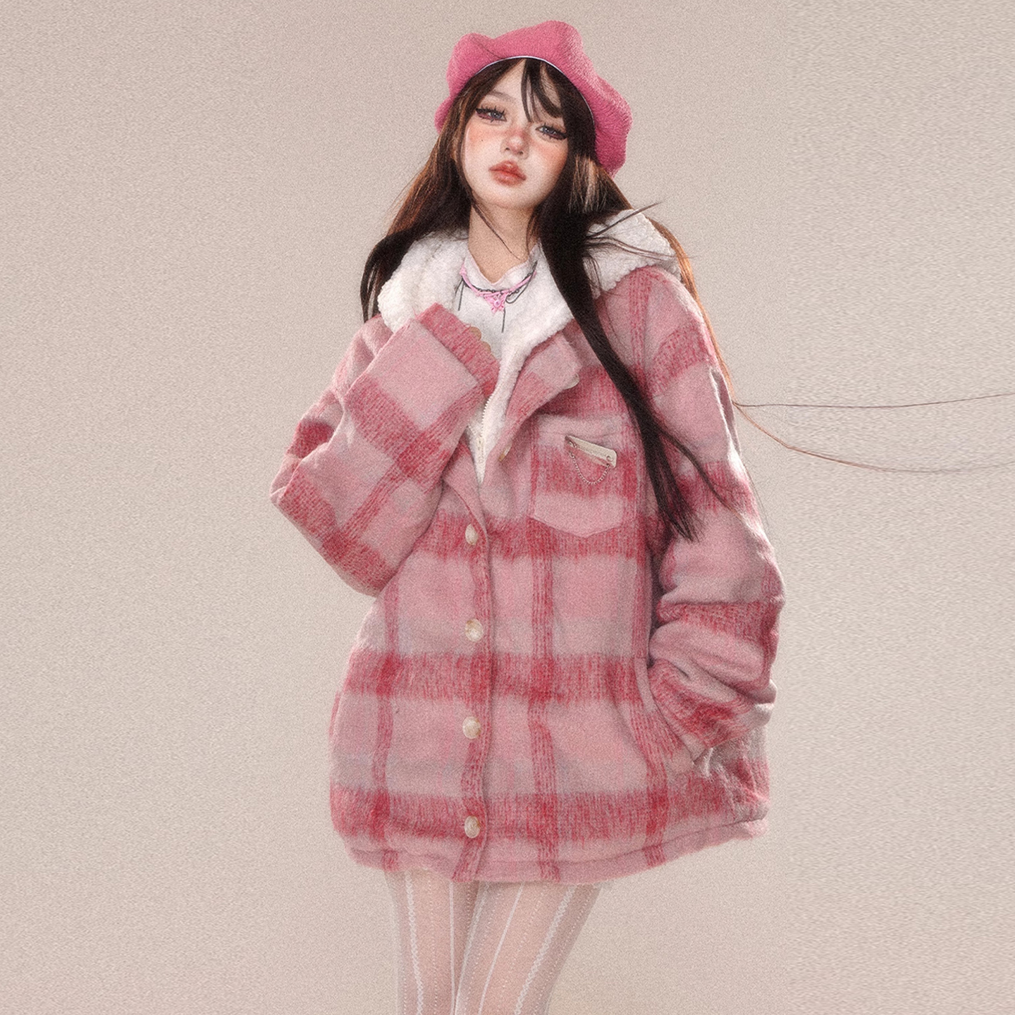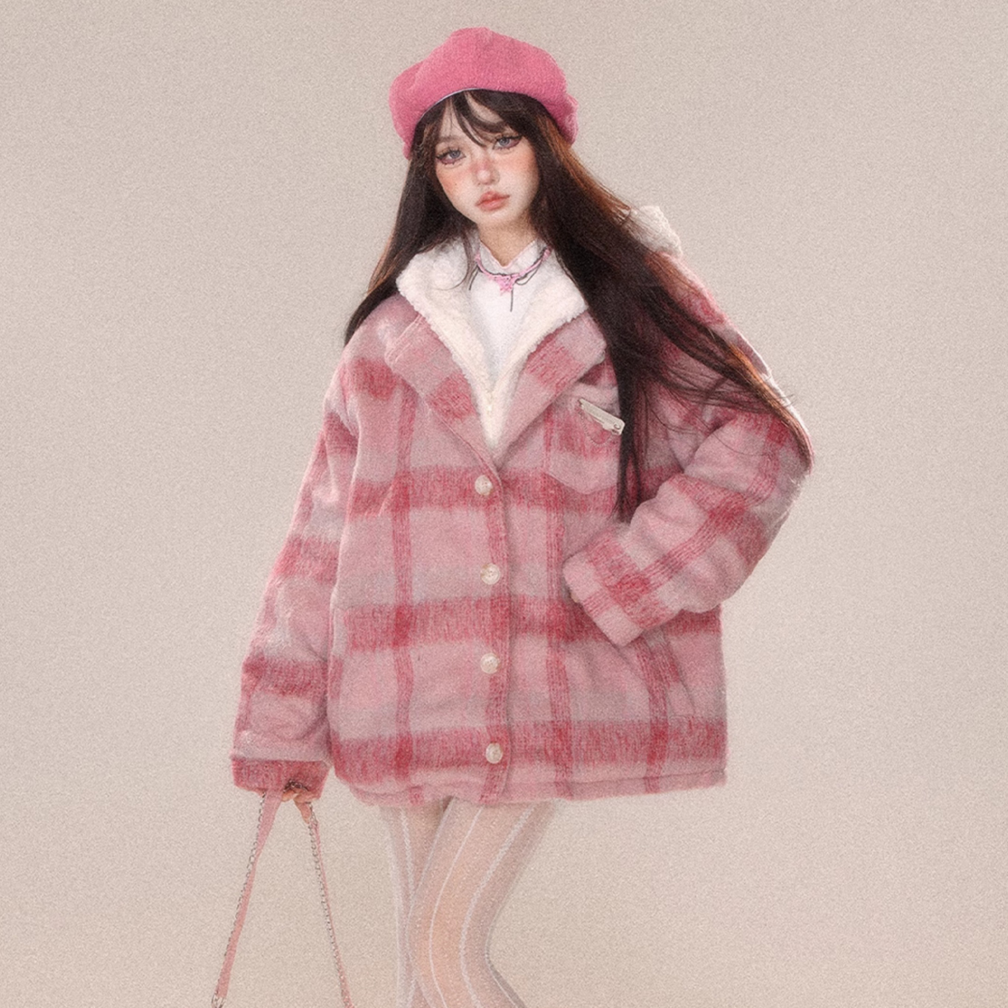大码甜美风粉色格纹假两件连帽棉服女秋冬胖mm保暖加厚高级感外套