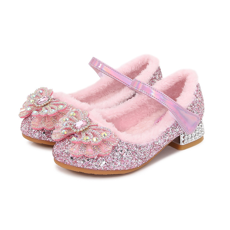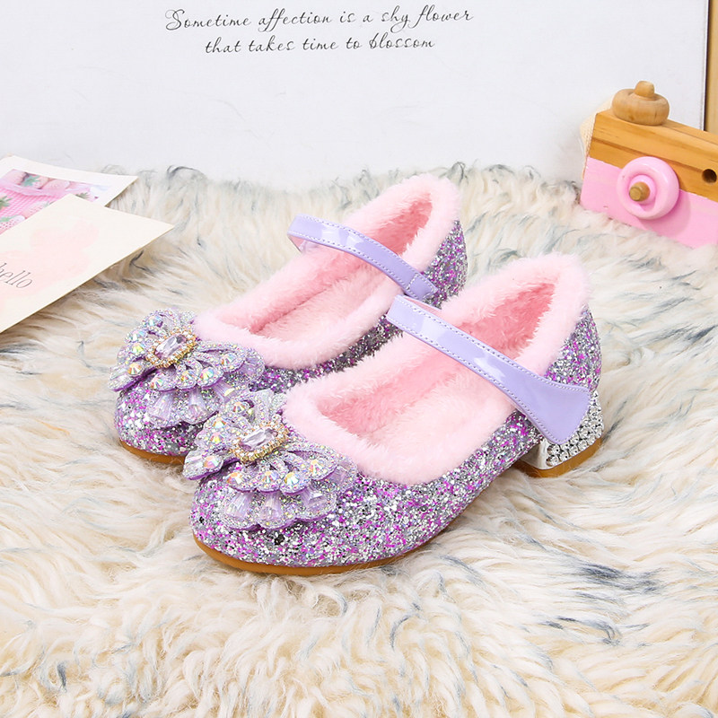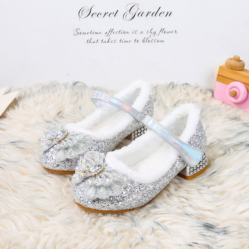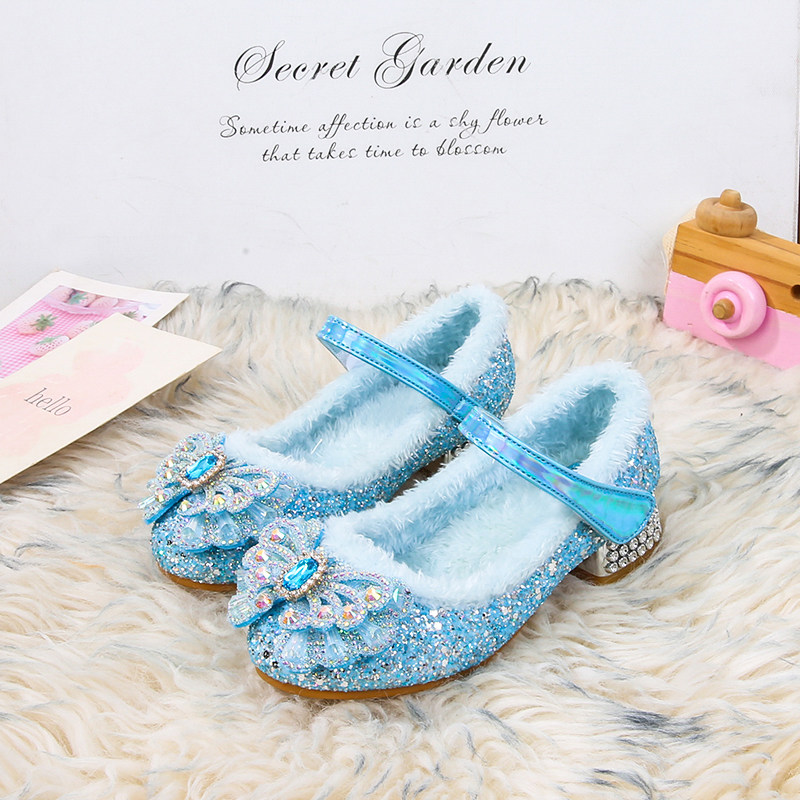 儿童高跟鞋秋冬季加绒女童爱莎公主鞋女孩皮鞋宝宝棉鞋艾莎水晶鞋