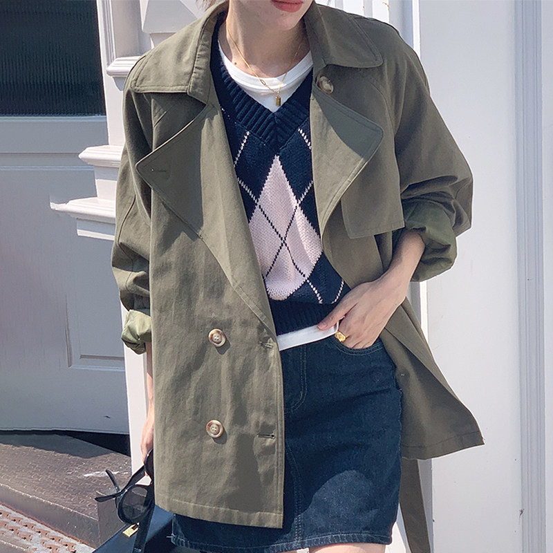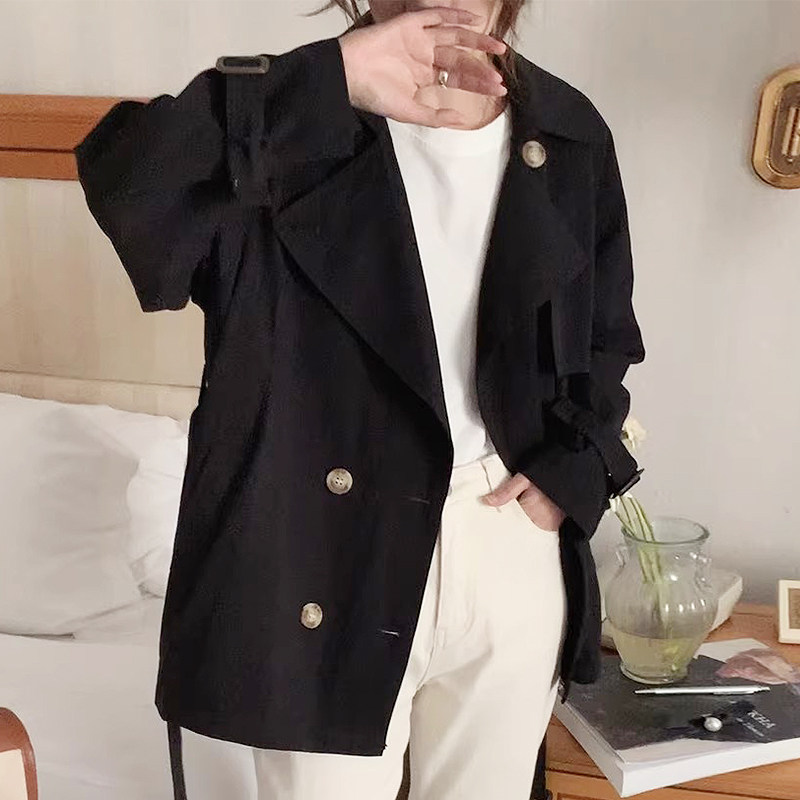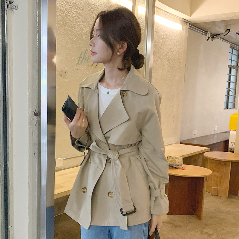 韩国chic秋季复古英伦风西装领双排扣系带收腰显瘦短款风衣外套女
