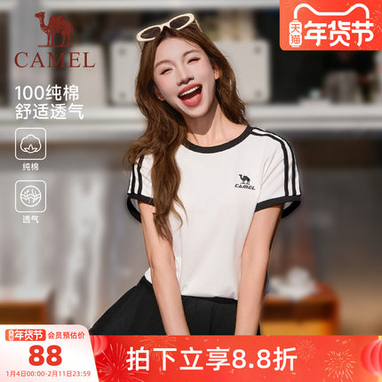 骆驼运动宽松纯棉T恤女休闲粉色短袖2025夏新款情侣复古上衣男