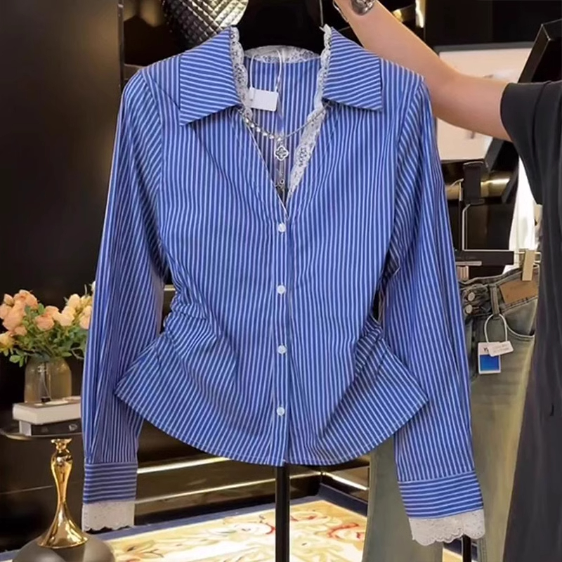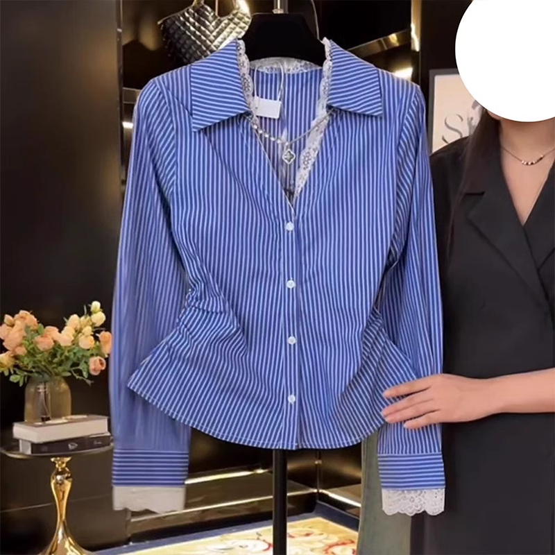 大码女装2025春季新款胖MM衬衫蕾丝花边气质显瘦褶皱条纹长袖衬衣