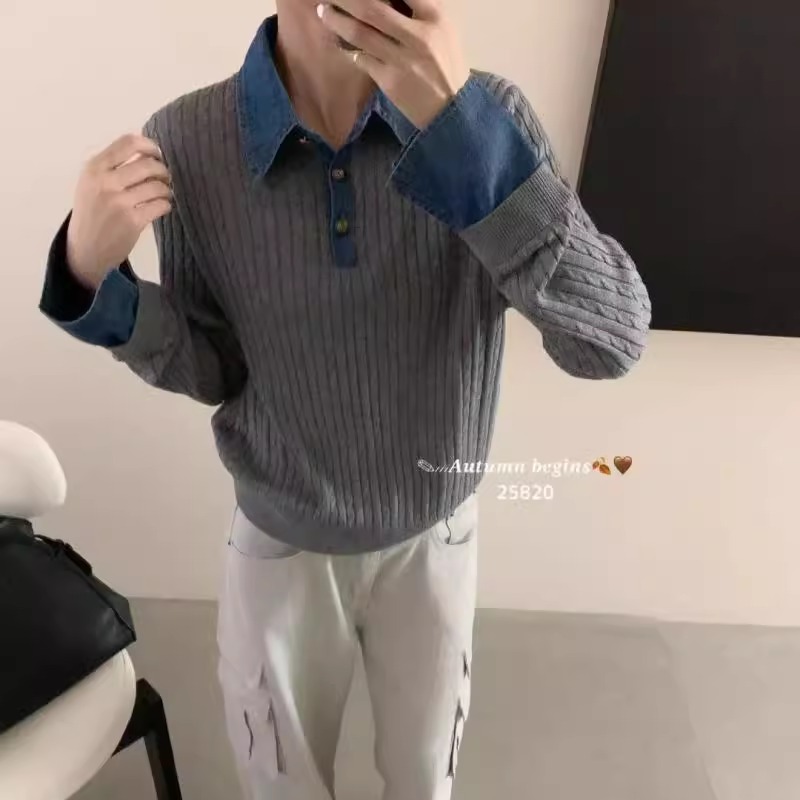 BADX正品2025秋季新款韩版气质Polo领牛仔拼接针织衫假两件毛衣女