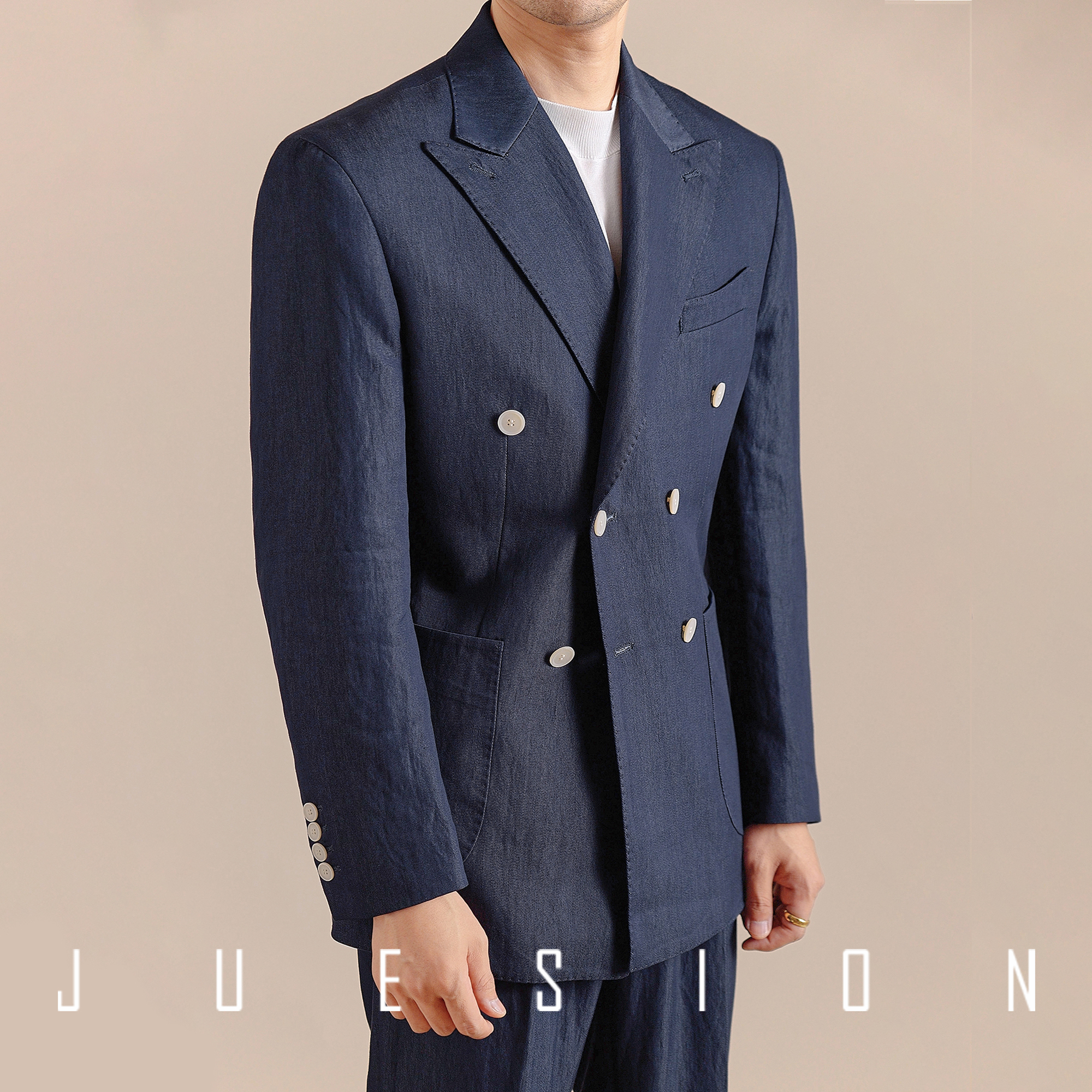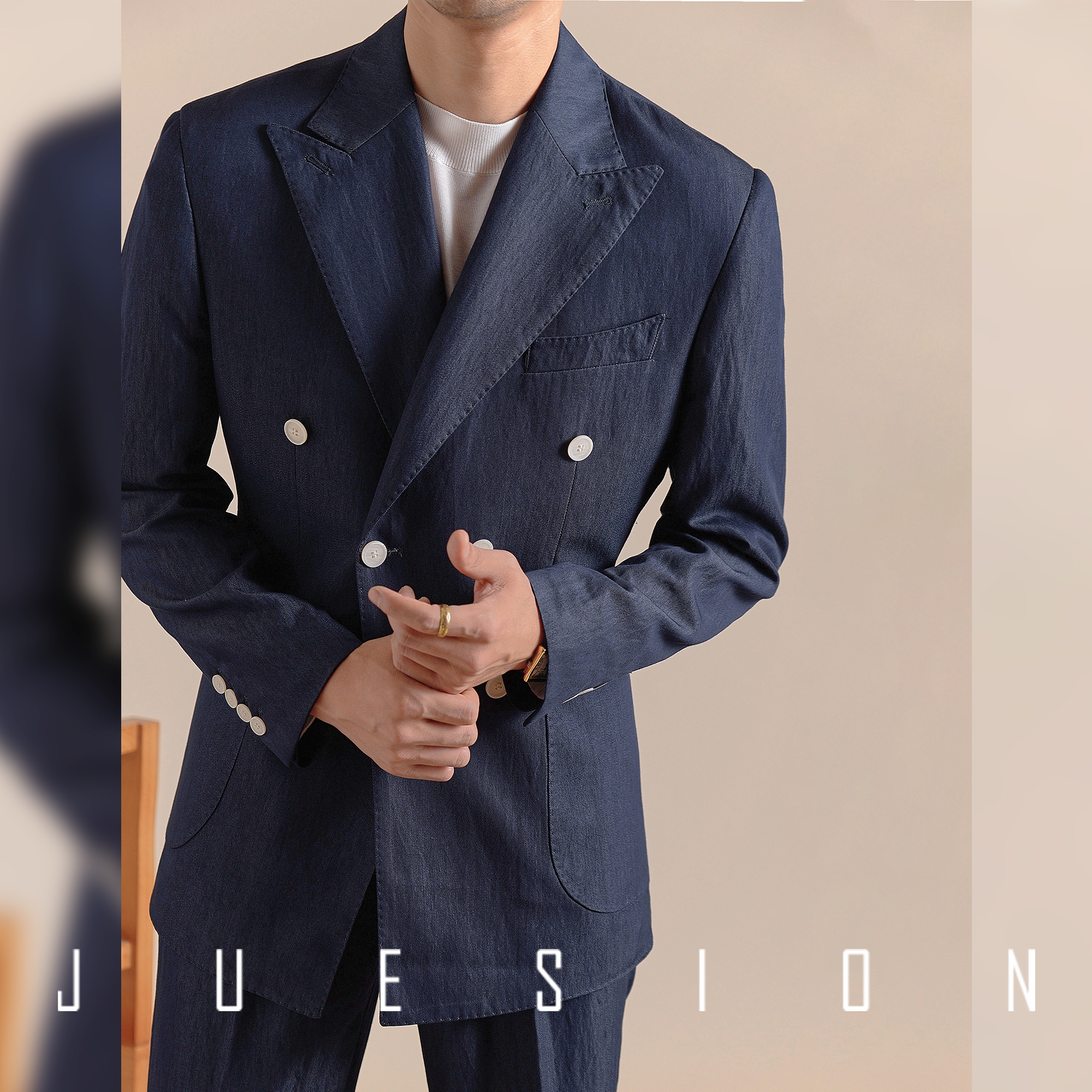 JUESION 春夏季牛仔蓝双排扣西服套装男士戗驳领休闲商务透气西装