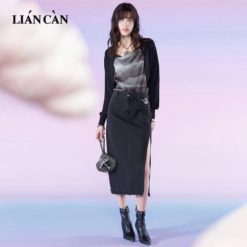 莲灿复古牛仔黑半身裙女2025春夏新款高腰斜开叉别针休闲直筒裙
