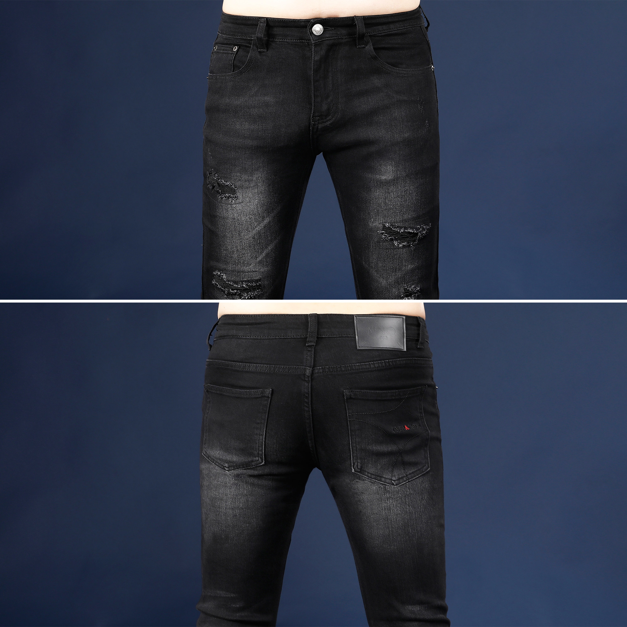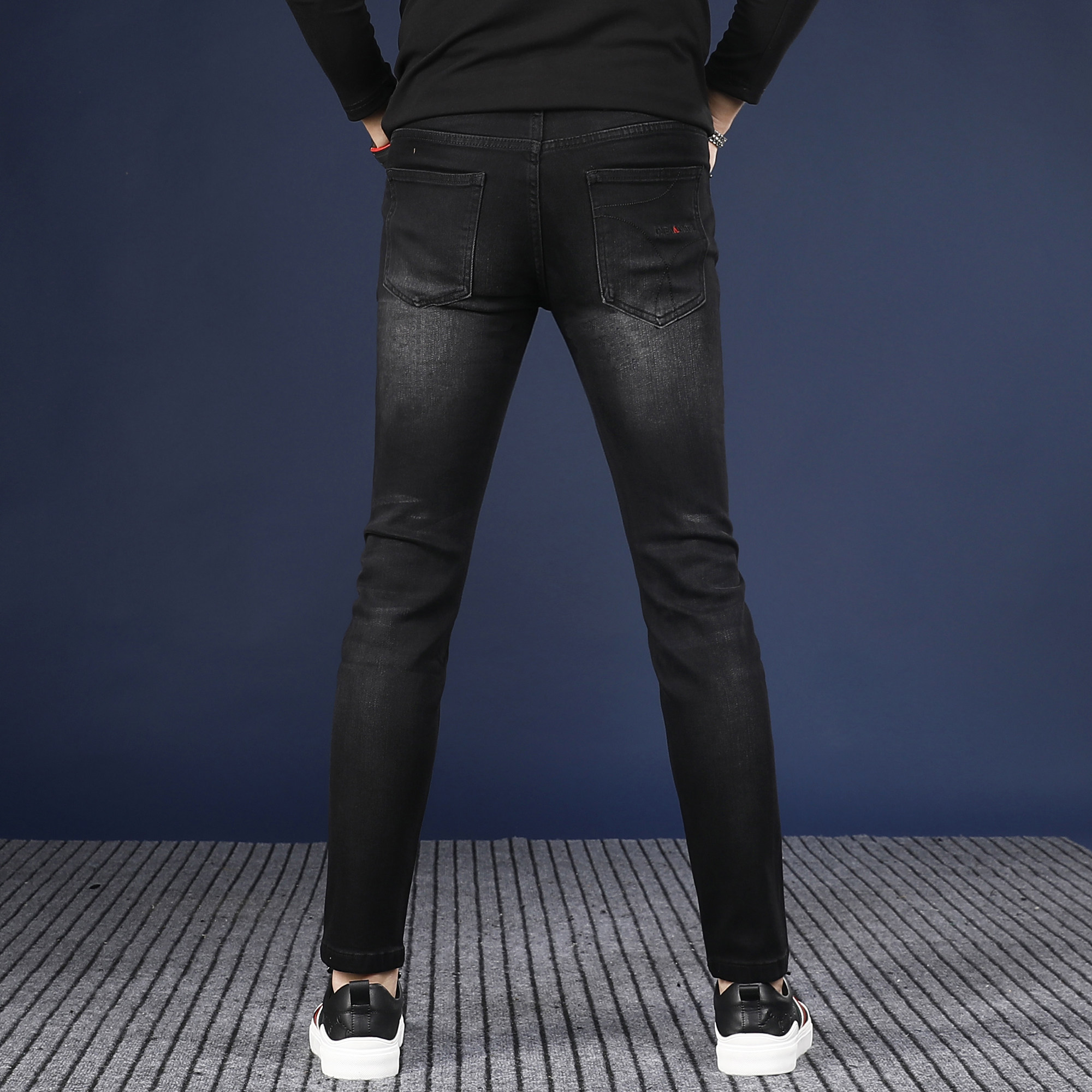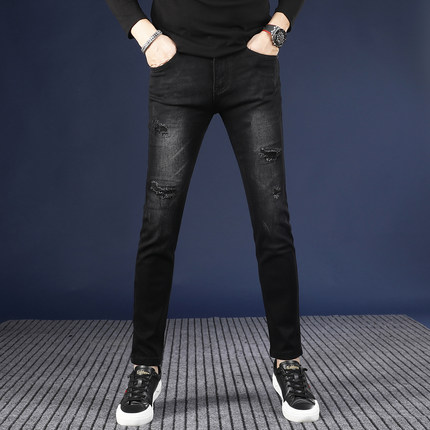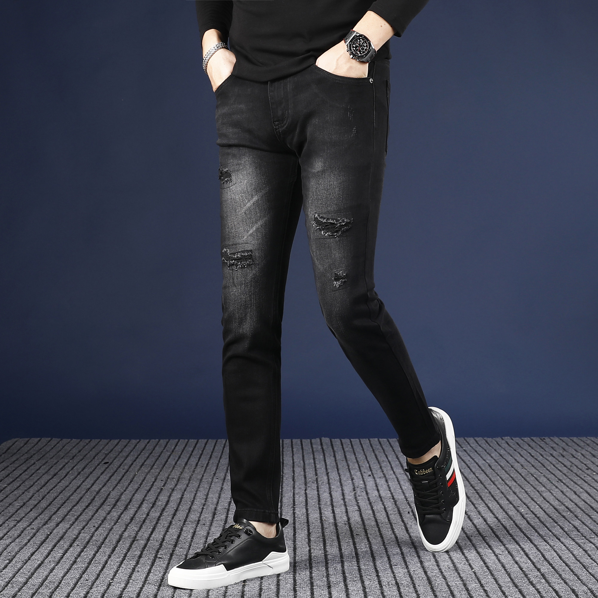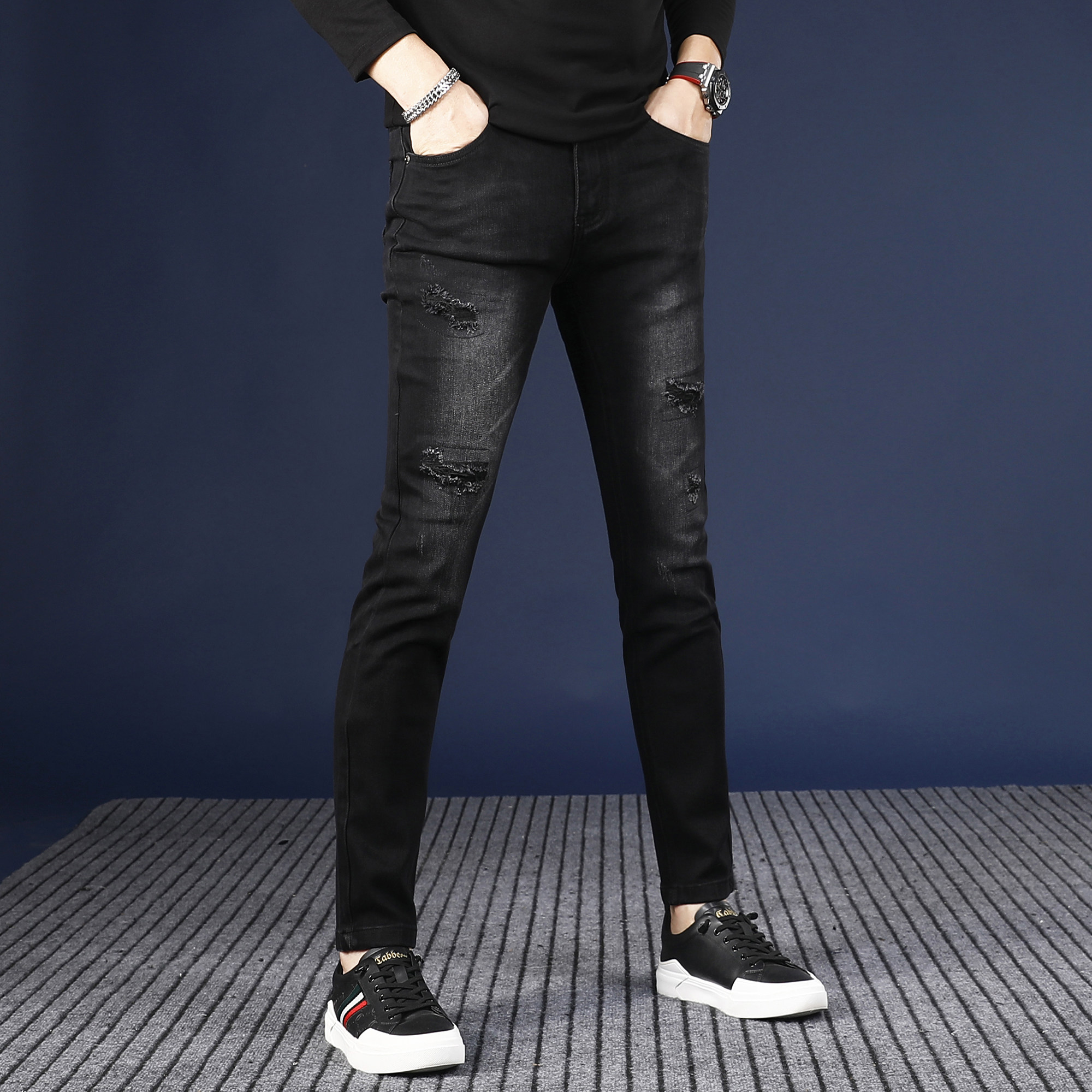 2024新款黑色破洞牛仔裤男款修身小脚裤韩版潮流弹力显瘦男士裤子