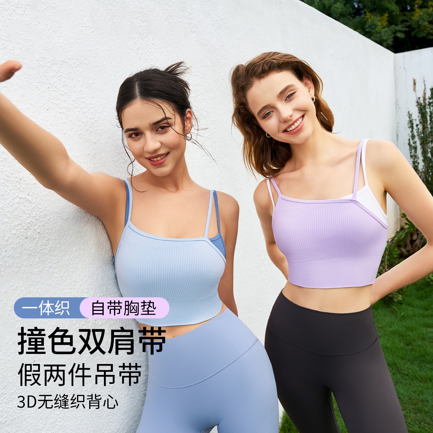 [今年流行-假两件撞色固定胸垫瑜伽背心]普拉提运动上衣吊带
