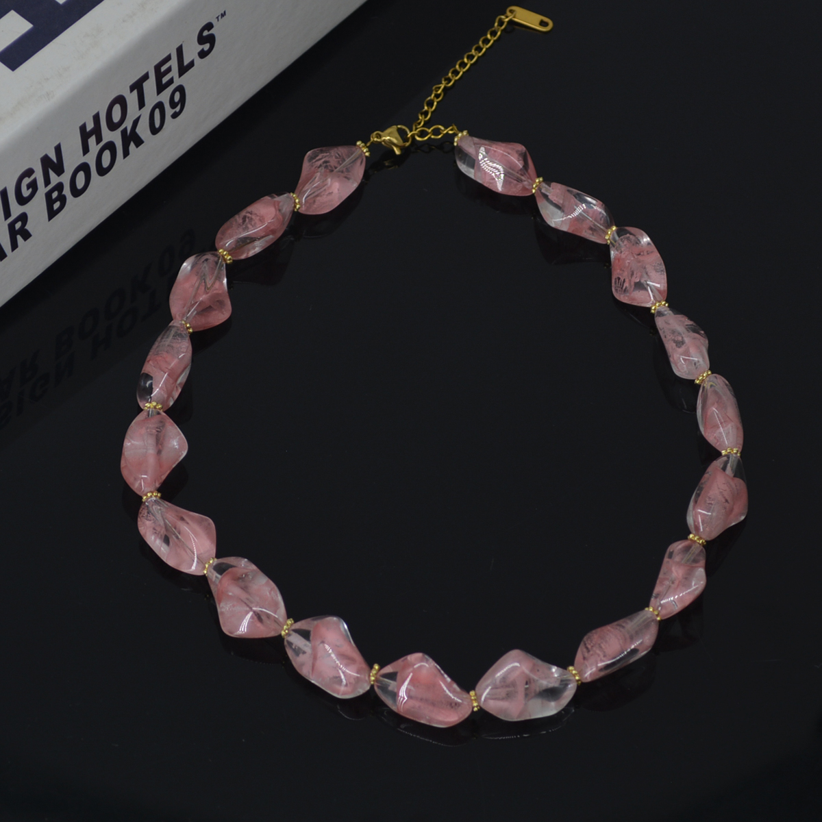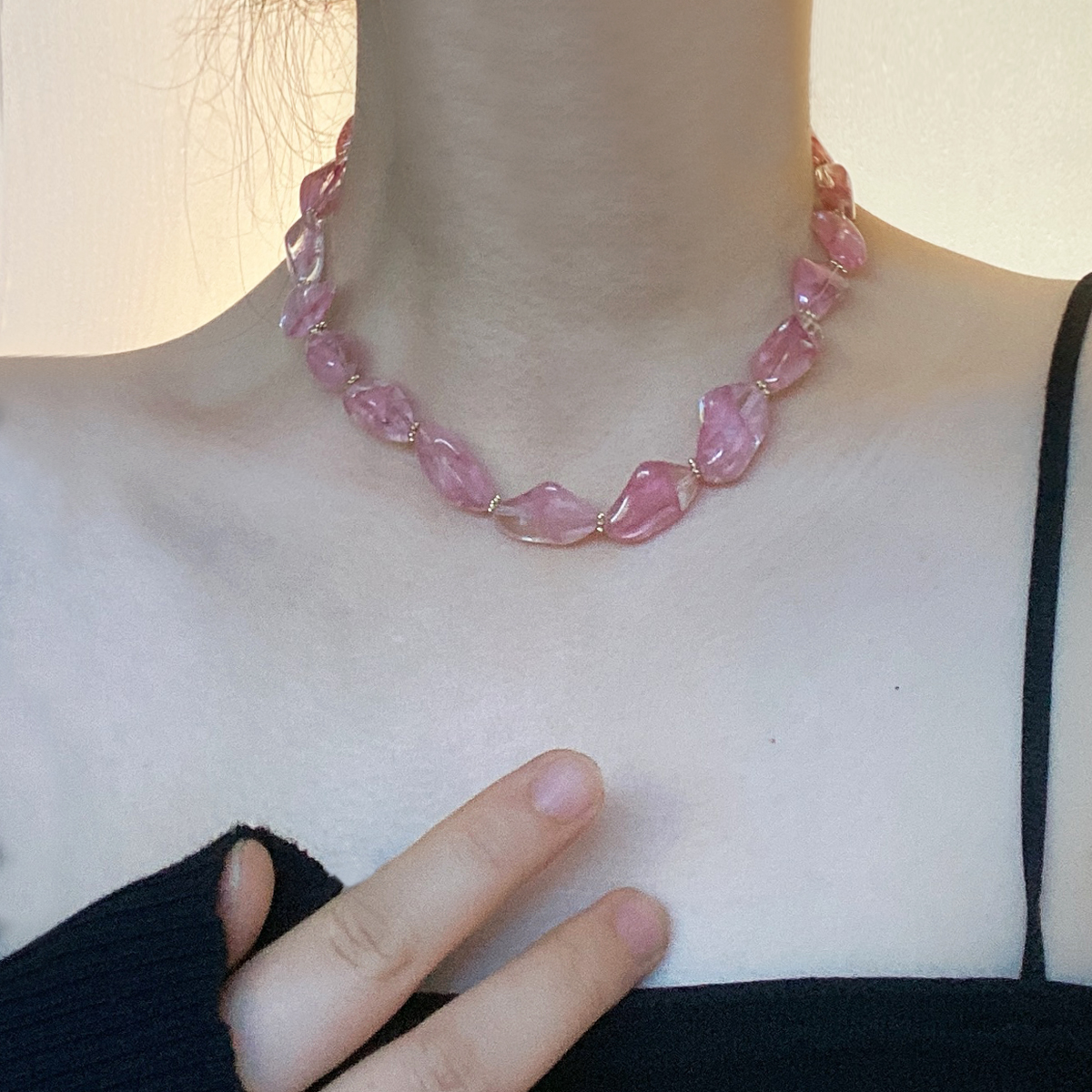超仙粉色水晶不规则玻璃串珠项链女士轻奢高级感复古异形锁骨链潮