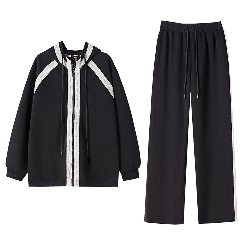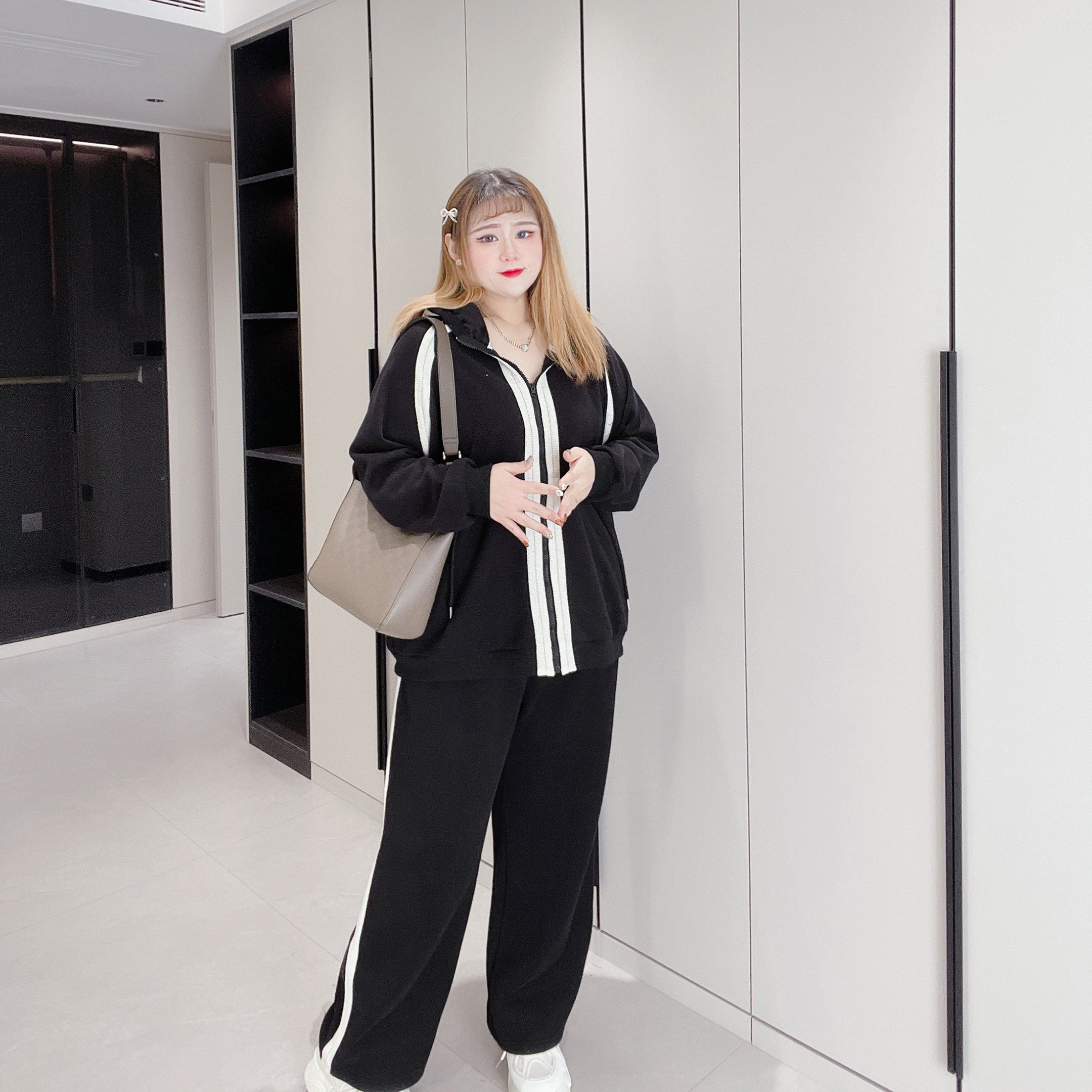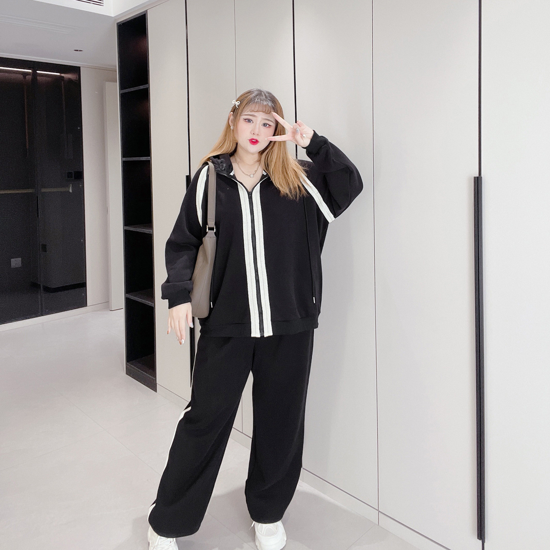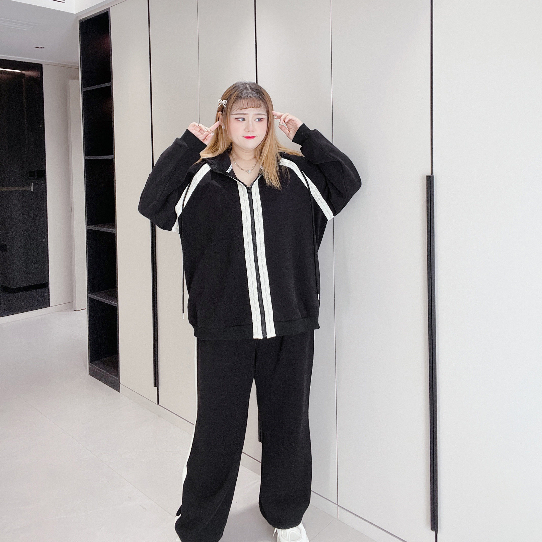 300斤特大码胖莹莹大码女装胖mm撞色加绒休闲简约卫衣长裤两件套