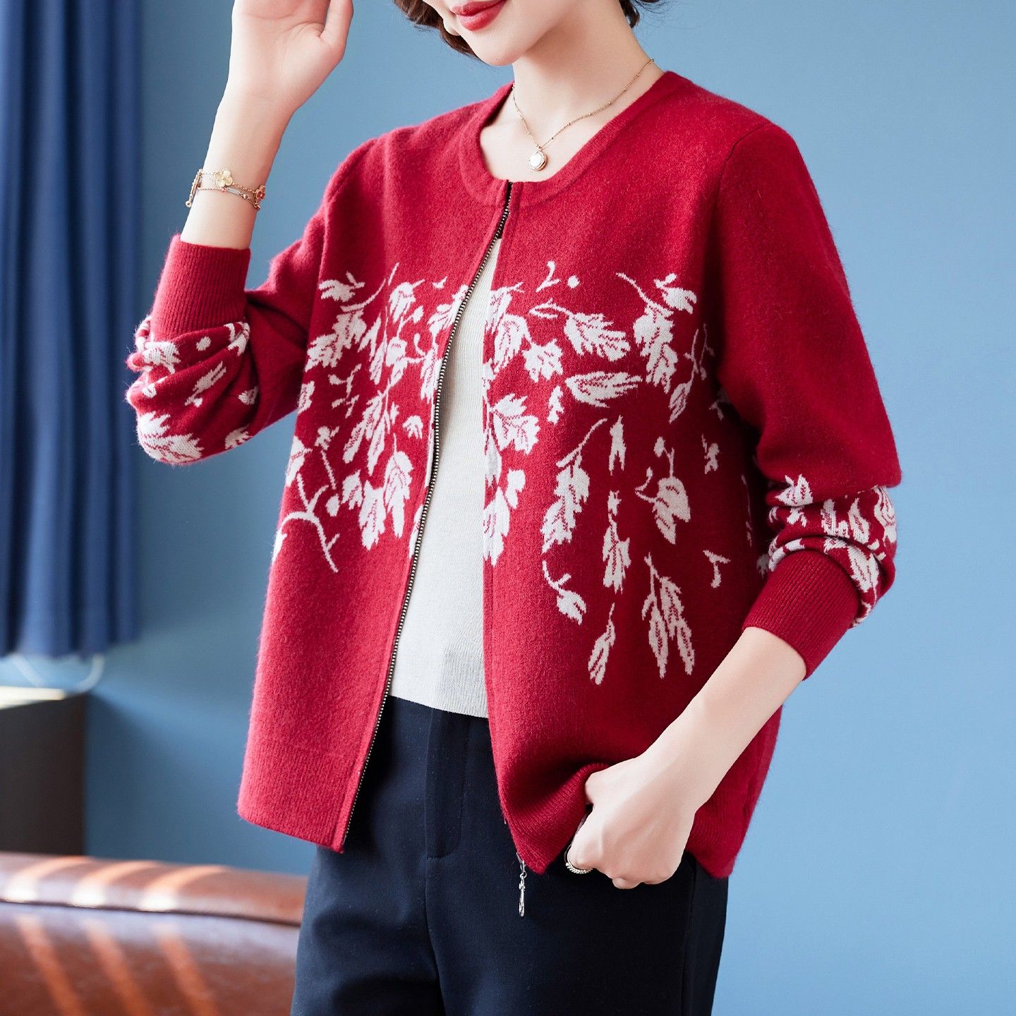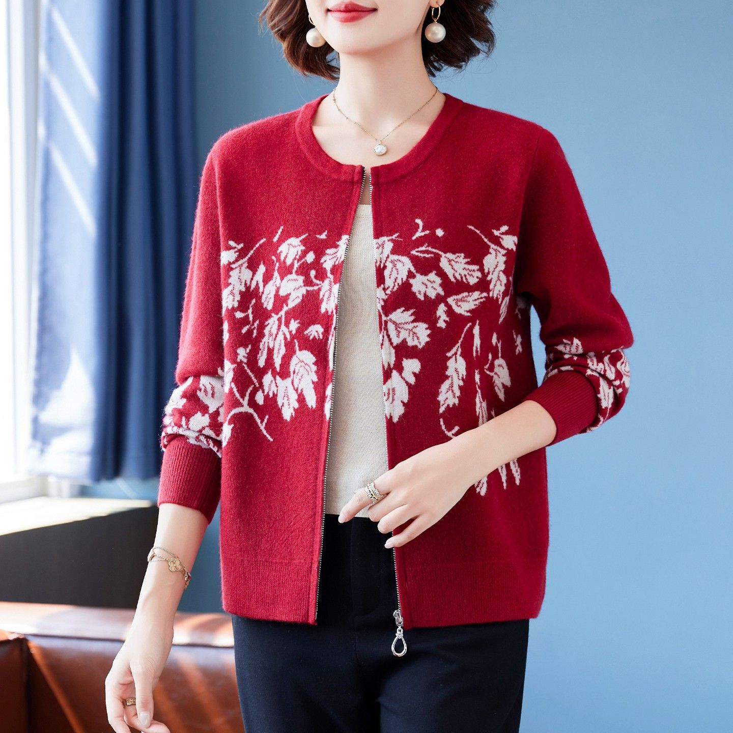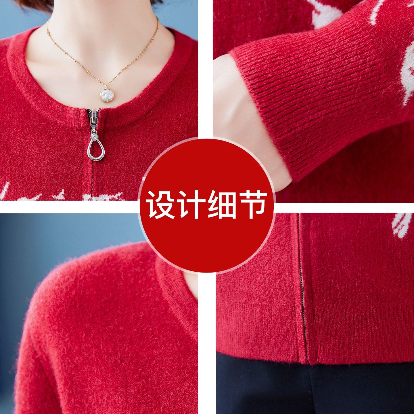 妈妈时尚针织短款外套中年女装春秋装开衫中老年洋气红色大码上衣