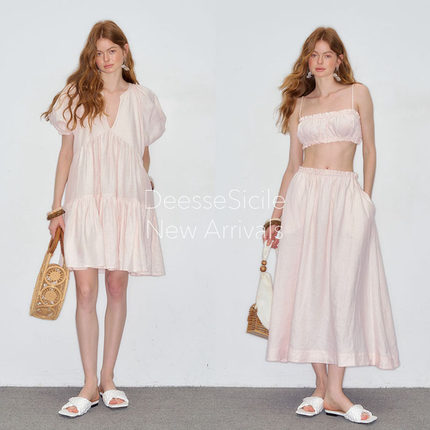 DeesseSicile 粉色100%亚麻亲子度假风套装系列泡泡袖V领连衣裙女