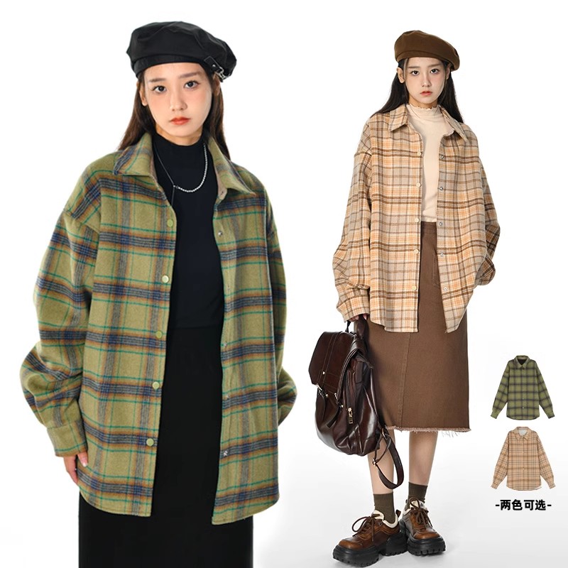 森女部落男友风磨毛格子衬衫外套长袖polo衫春秋款宽松情侣装新款