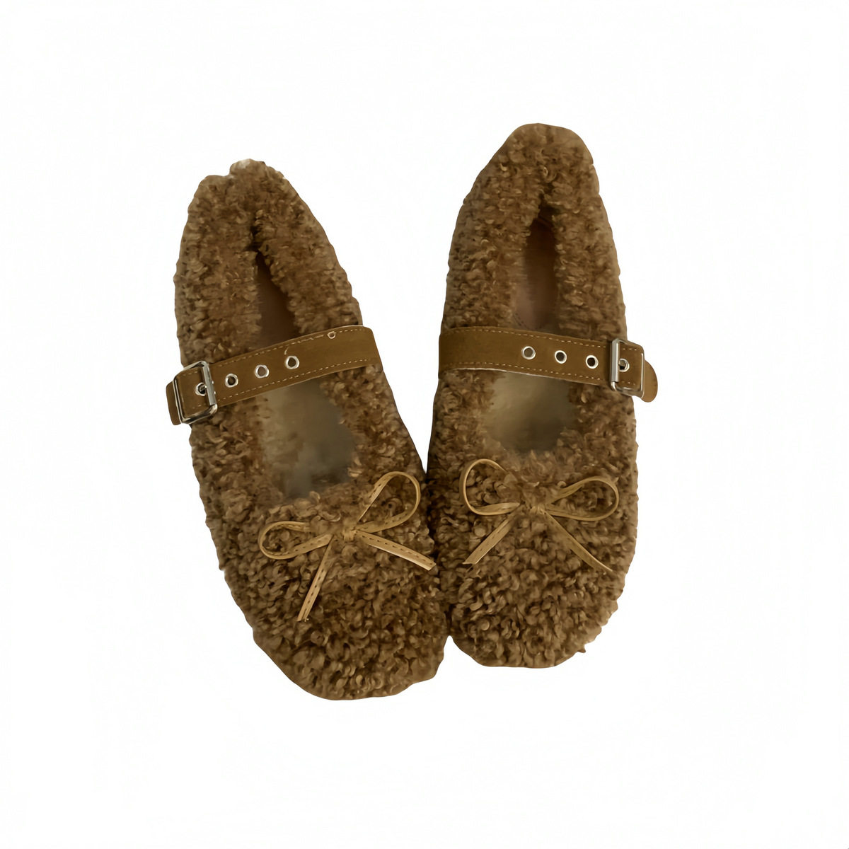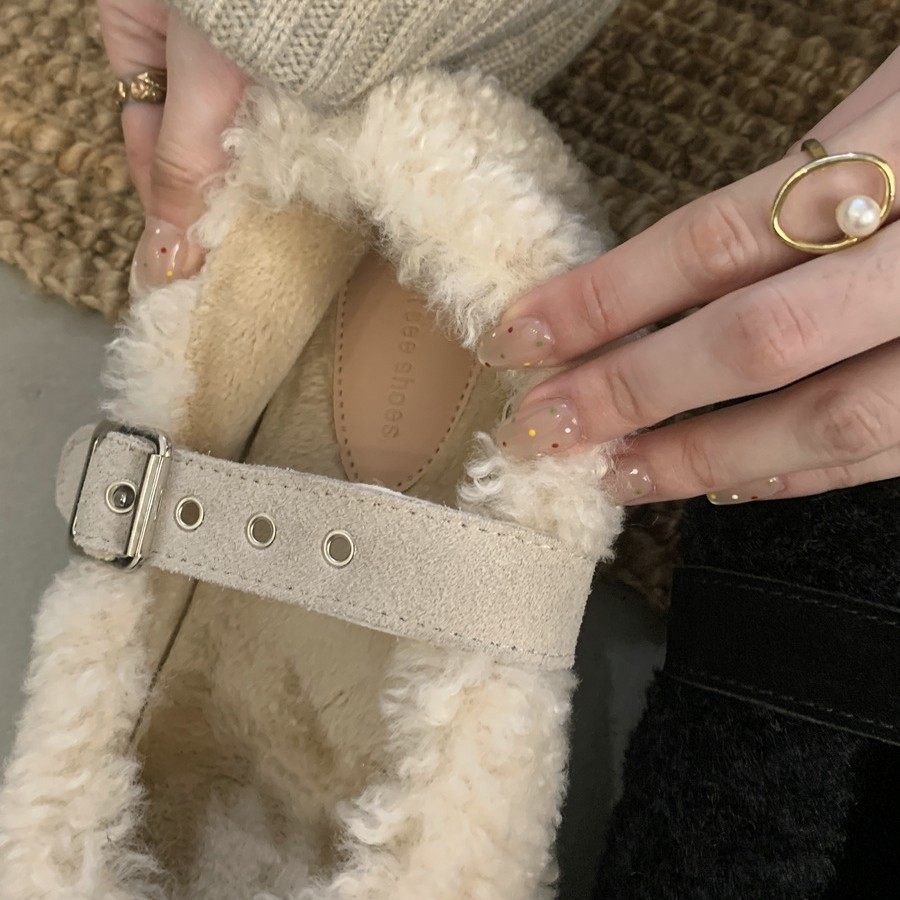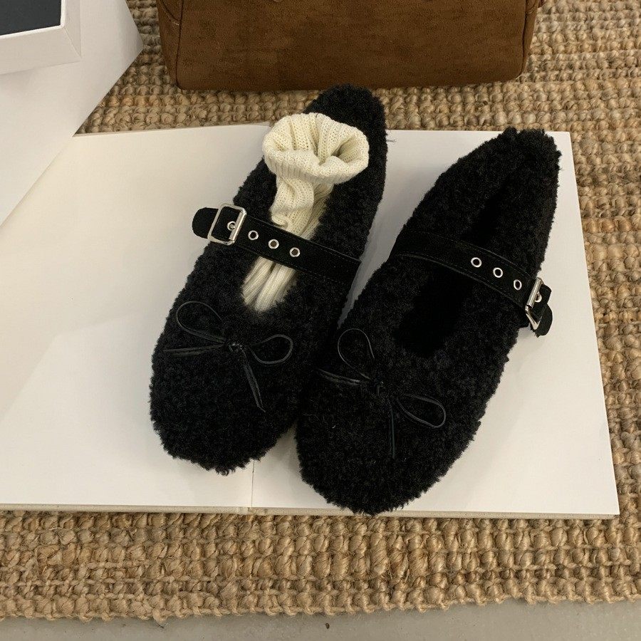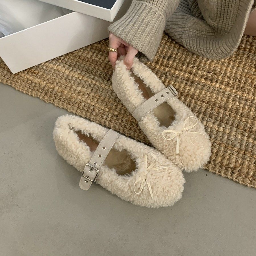 美呆!毛毛鞋女2025新款蝴蝶结平底加厚玛丽珍加绒保暖羊羔毛单鞋