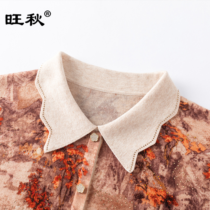 旺秋新女装民族风印花毛衣秋冬款妈妈装套头羊毛衫翻领镶钻打底衫