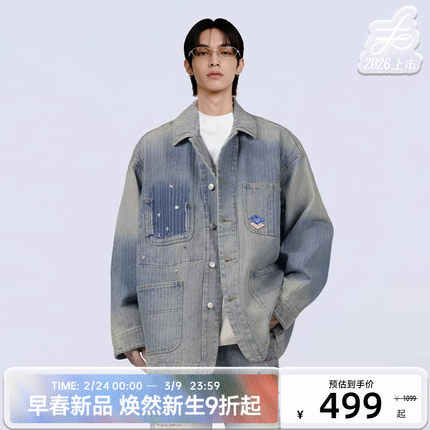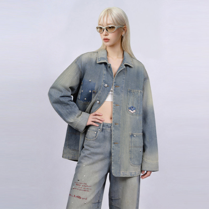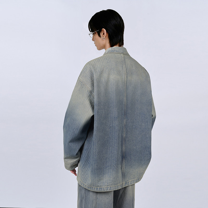 陈伟霆外套CANOTWAIT_水洗做旧撞钉条纹牛仔外套夹克肌理感宽松