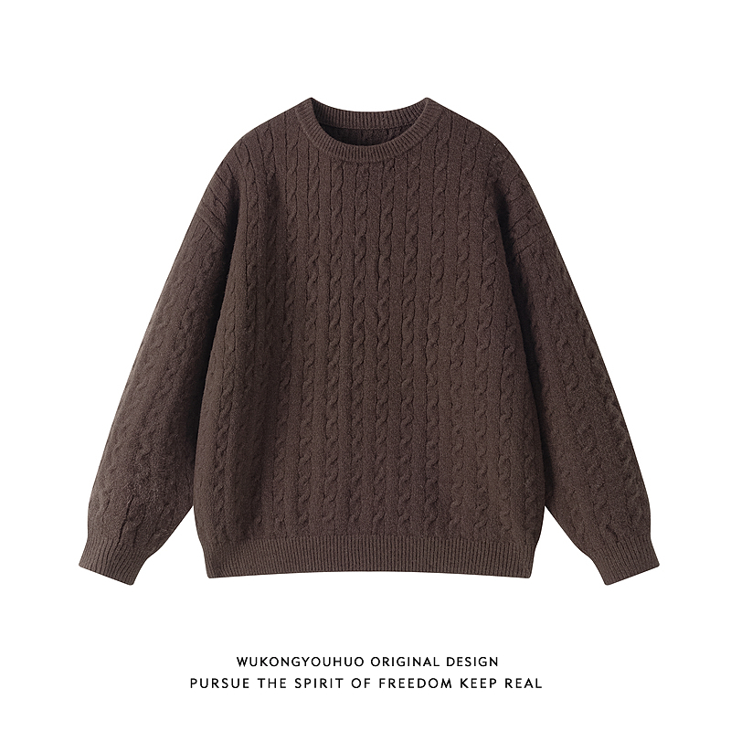 悟空有货潮牌复古老钱风纯色圆领针织衫男女秋季情侣宽松休闲毛衣