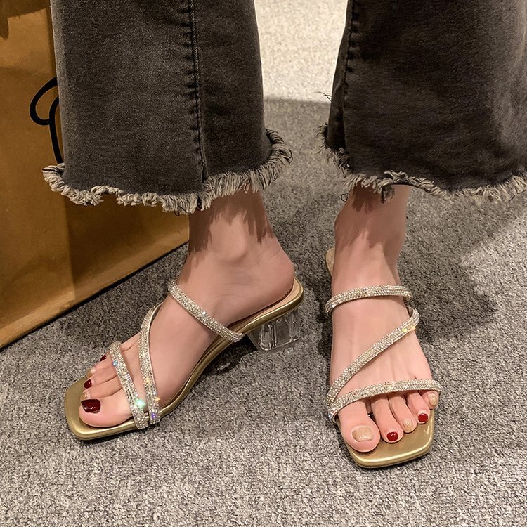 高跟水钻凉鞋女2025夏季新款外穿法式透明配裙子水晶粗跟仙女拖鞋