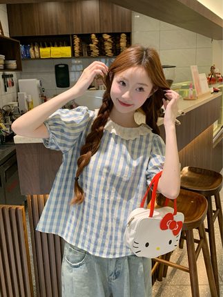学院风蕾丝花边格子单排扣短袖衬衫女夏季宽松衬衣洋气泡泡袖上衣