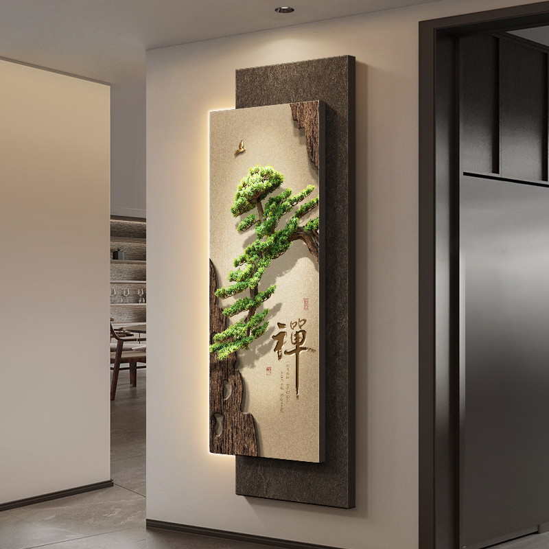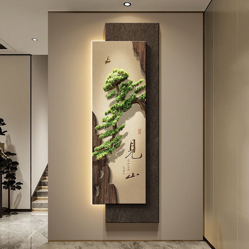 迎客松玄关装饰画新中式砂岩走廊过道挂画高级感入户正对门壁画灯