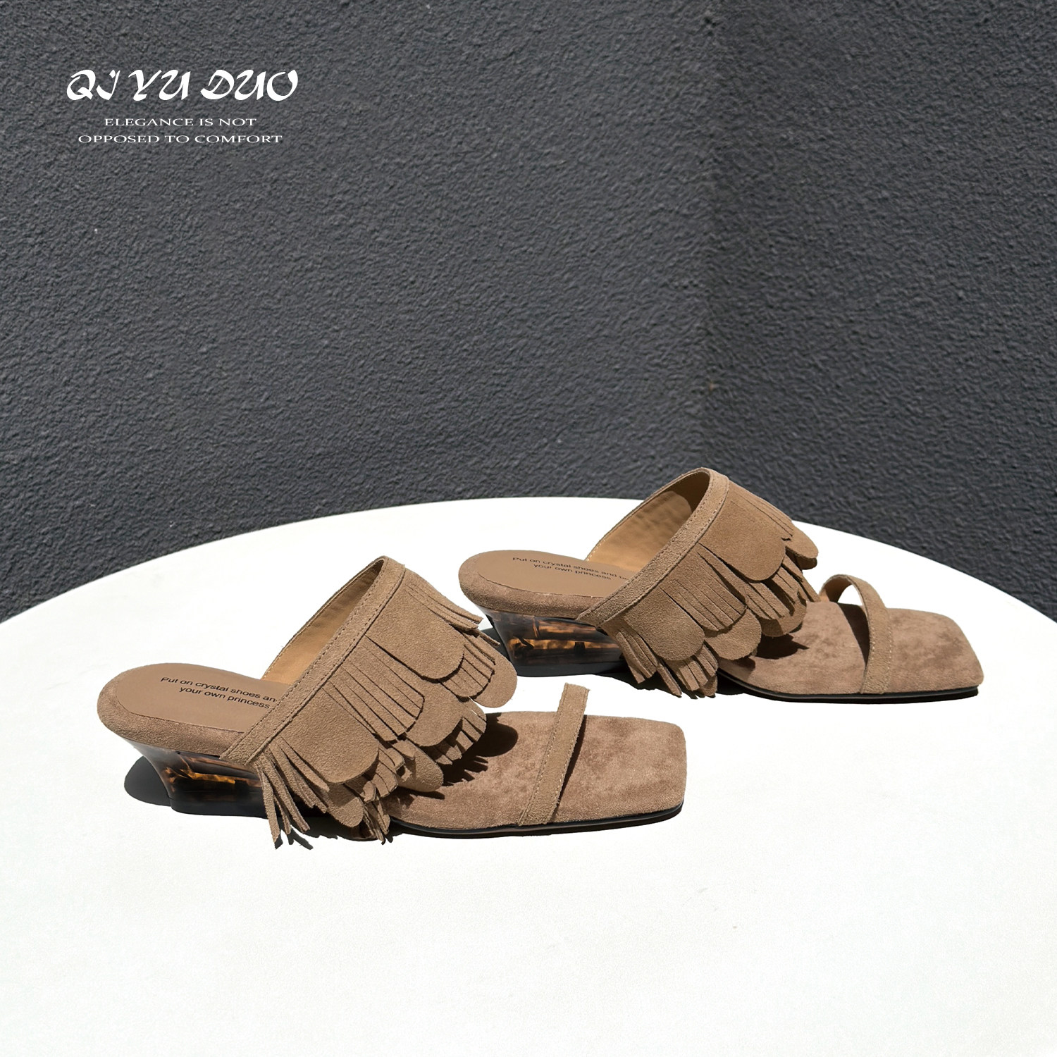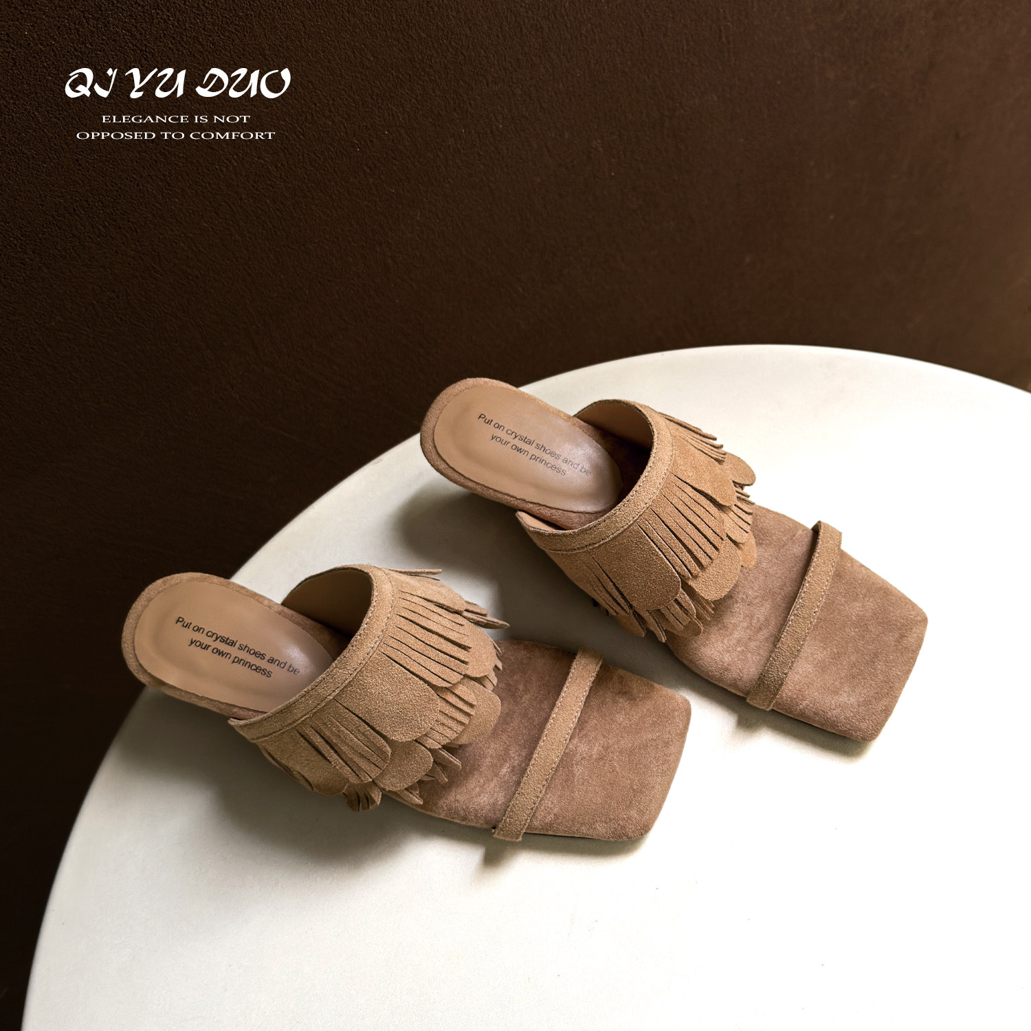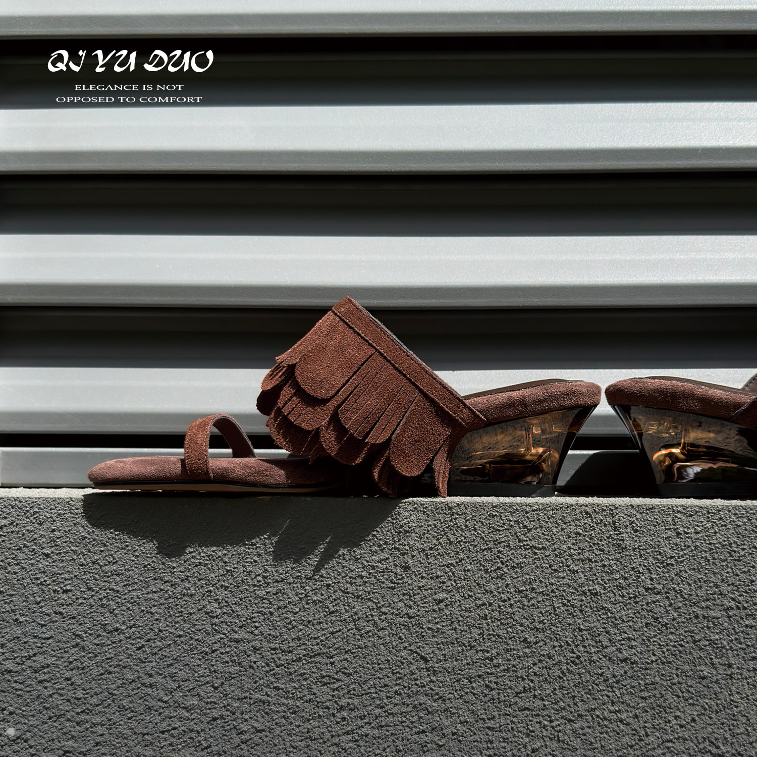 【七与多】牛皮/5cm坡跟流苏外穿凉拖鞋女方头高跟露趾一字带凉鞋