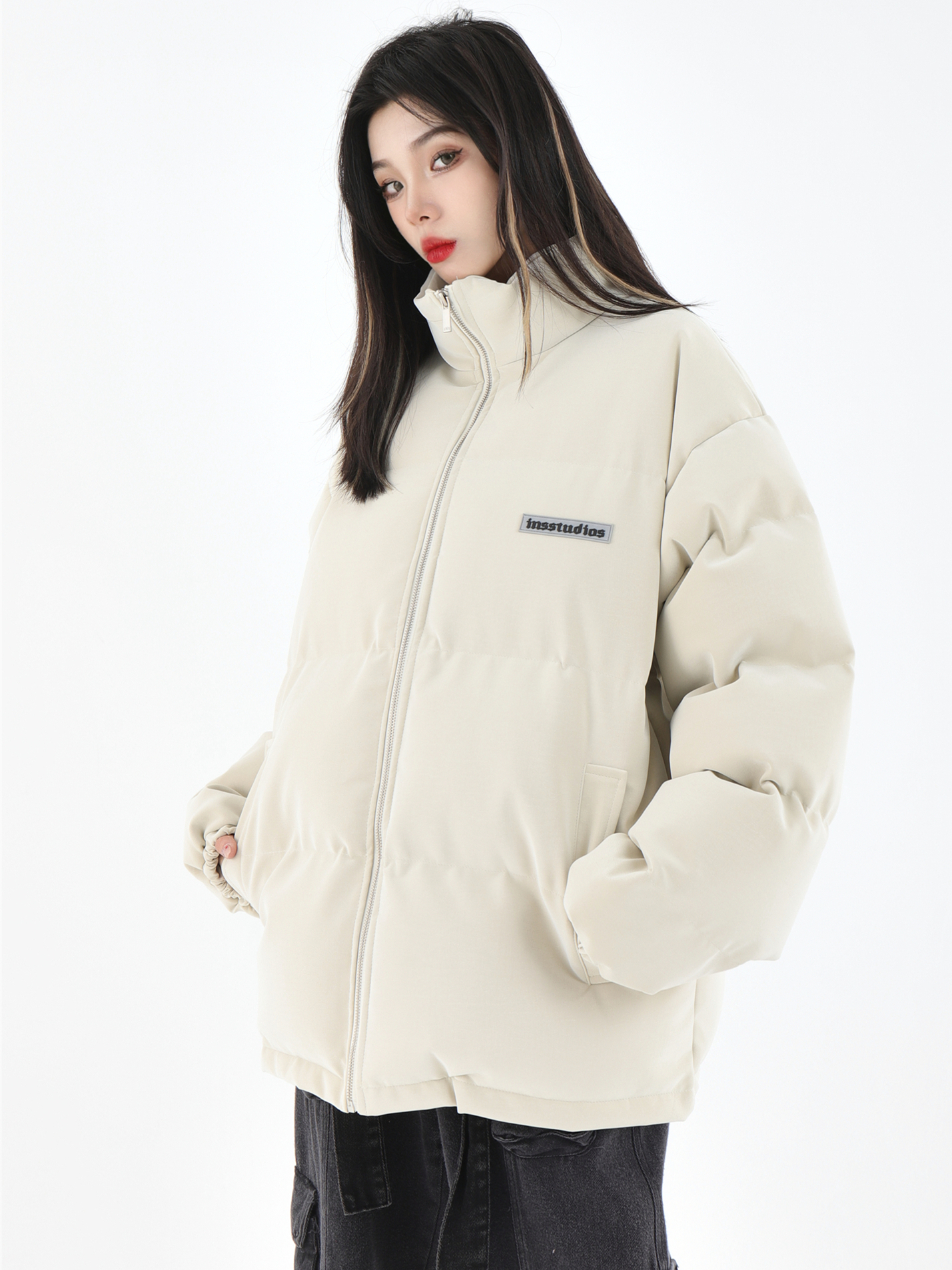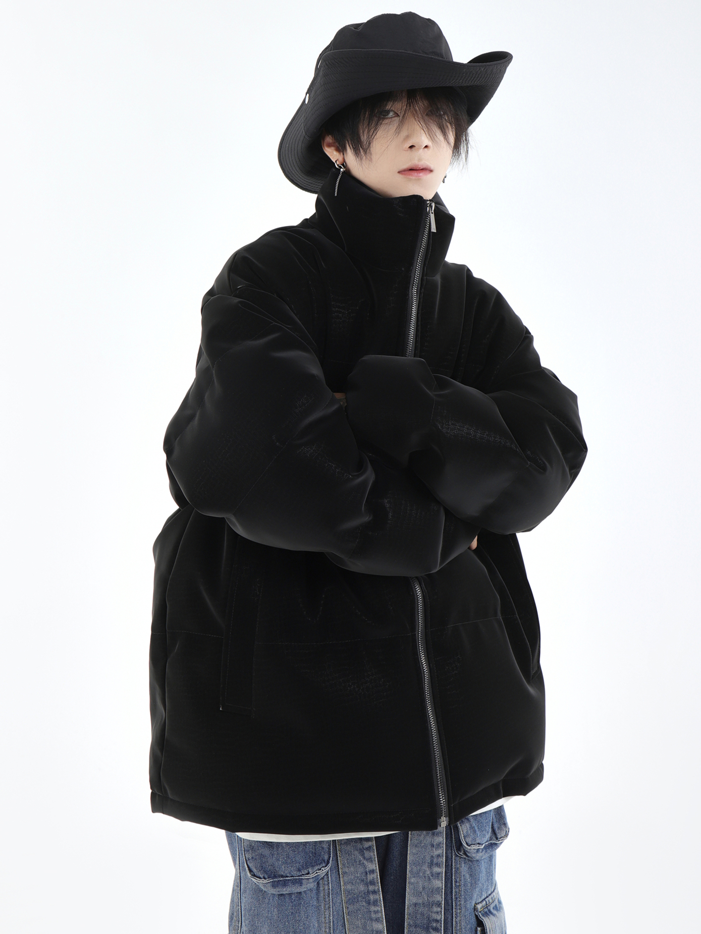 INSstudios 国潮牌冬季情侣美式胶标纹理感棉服宽松棉衣PU皮外套