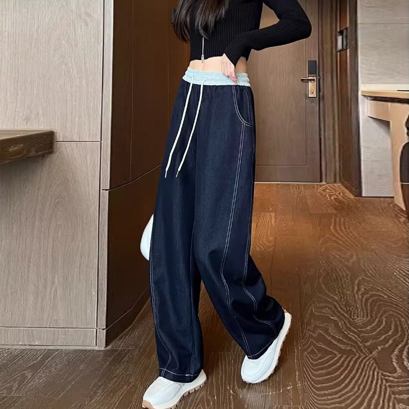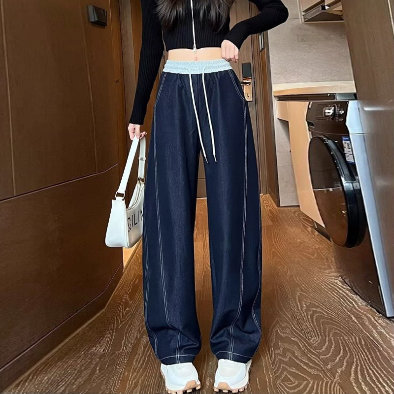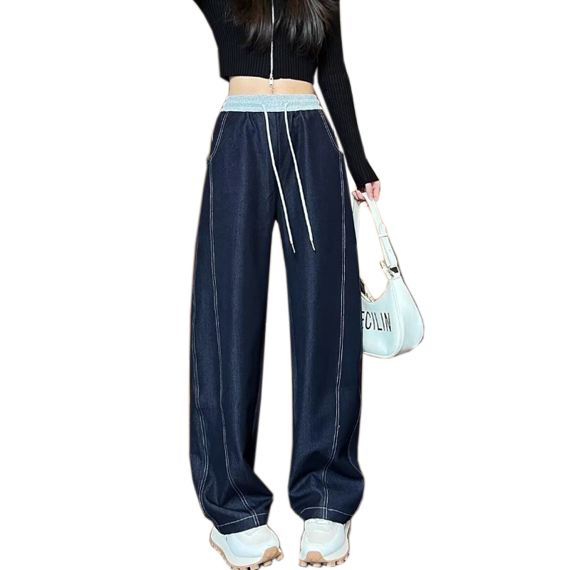 深蓝慵懒弯刀裤大码阔腿松紧高腰牛仔裤垂坠感长裤直筒拖地裤子女