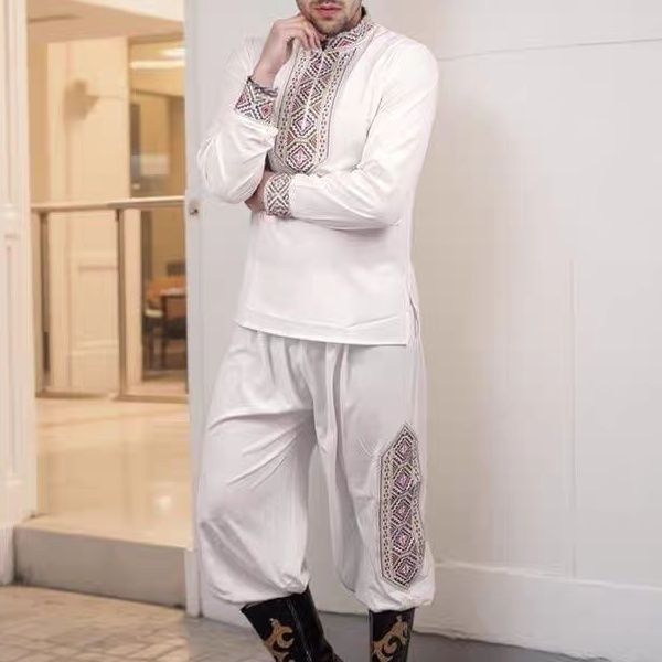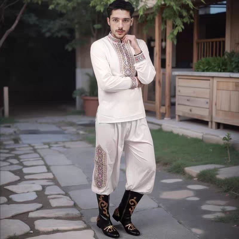 新款新疆舞蹈维吾尔族舞蹈服演出服装套男士广场跳舞男士纯绣花