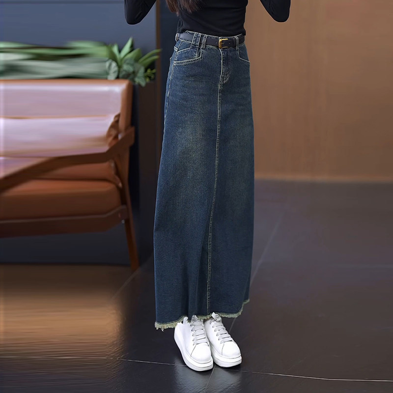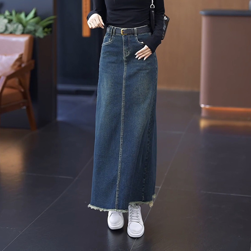 复古高腰牛仔半身裙女2025早秋季气质a字深蓝不开叉包臀毛边长裙