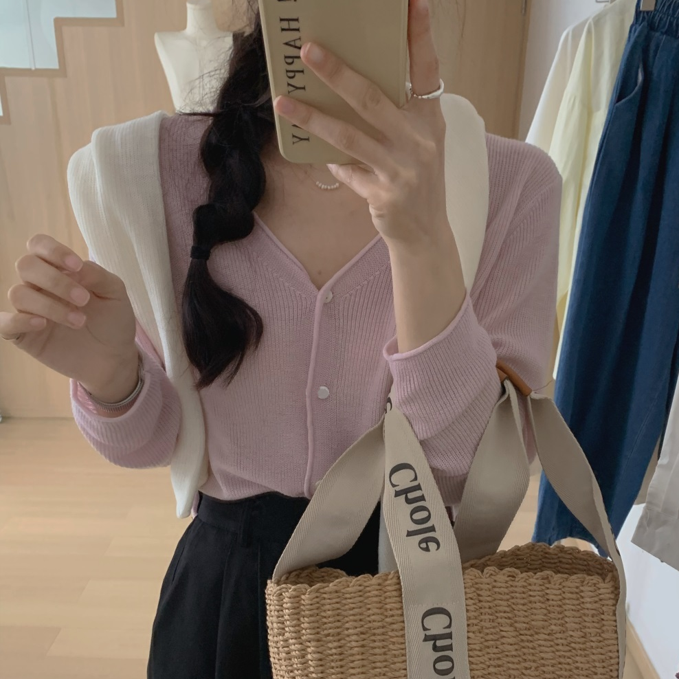 韩系春秋季ins宽松针织开衫女薄款上衣v领防晒外搭长袖空调衫外套