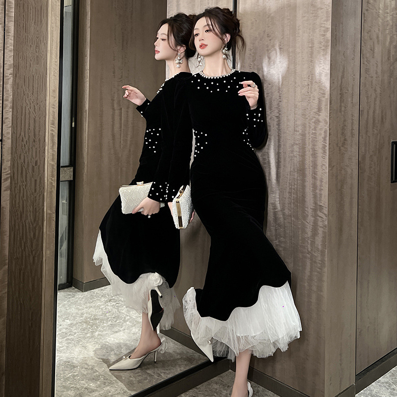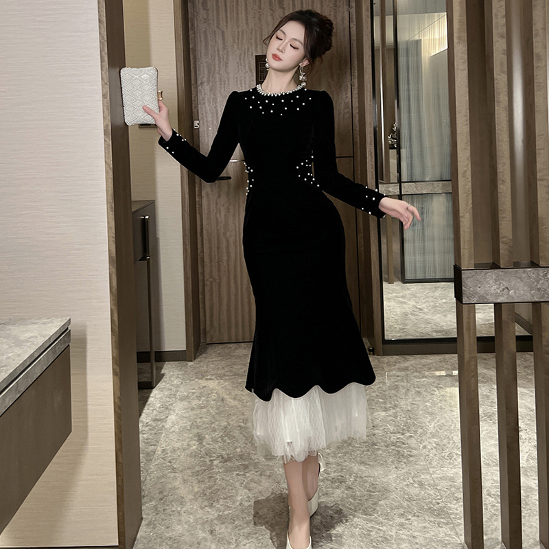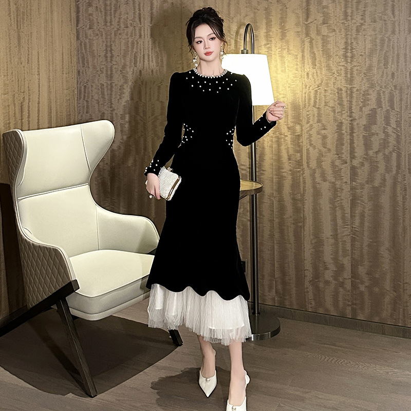 2025春装新款女装法式钉珠圆领修身不规则鱼尾丝绒连衣裙21630