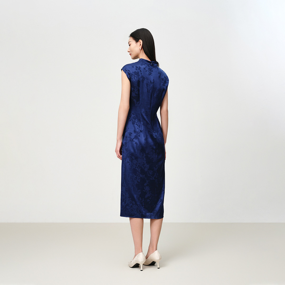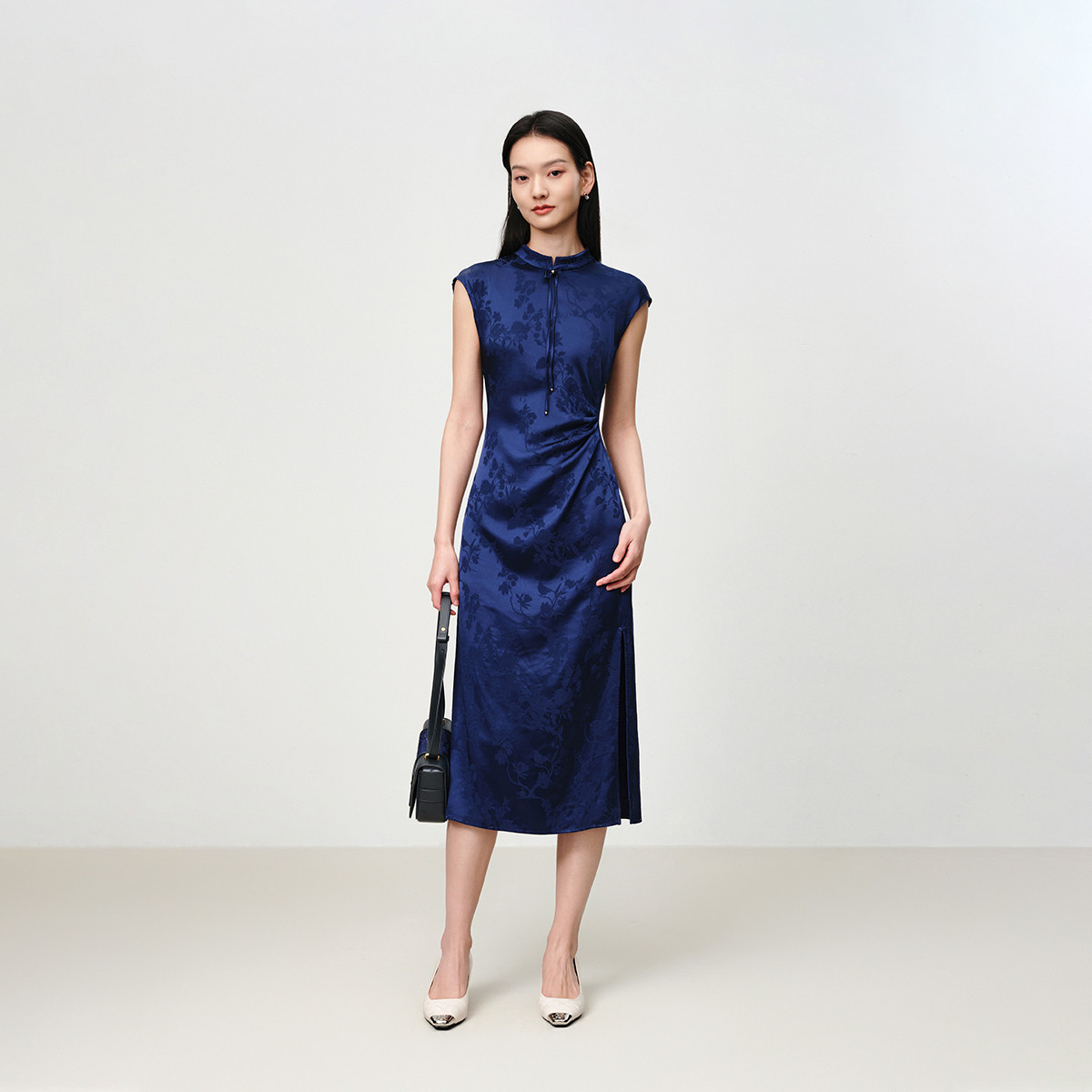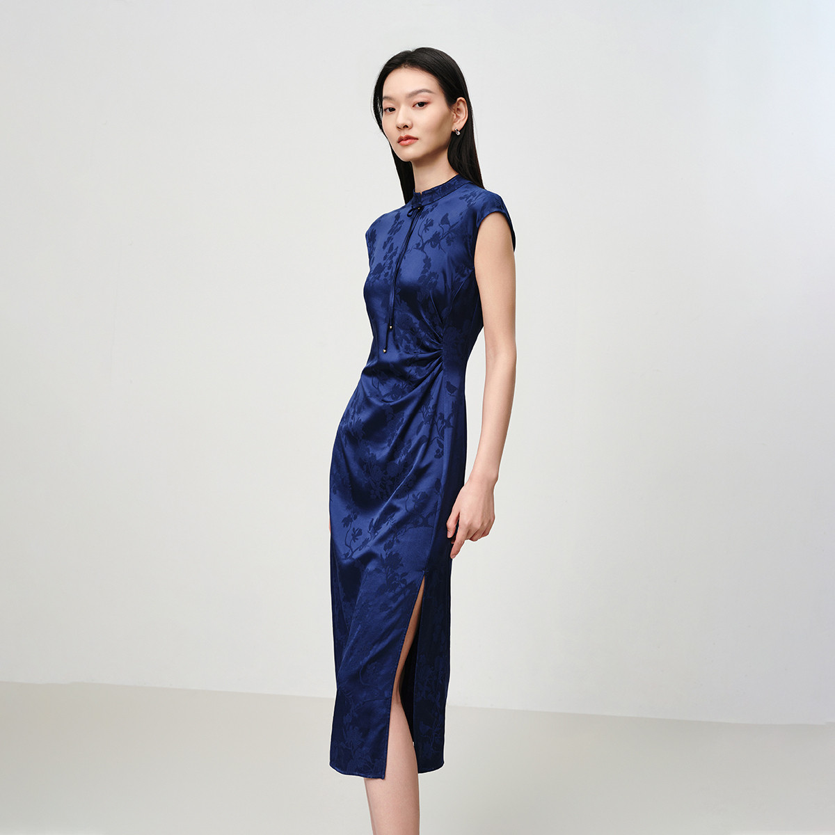 雅莹真丝提花收腰开衩连衣裙