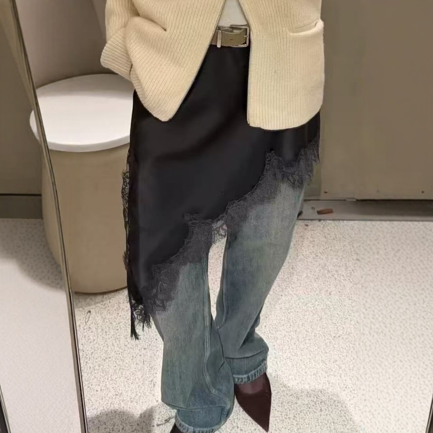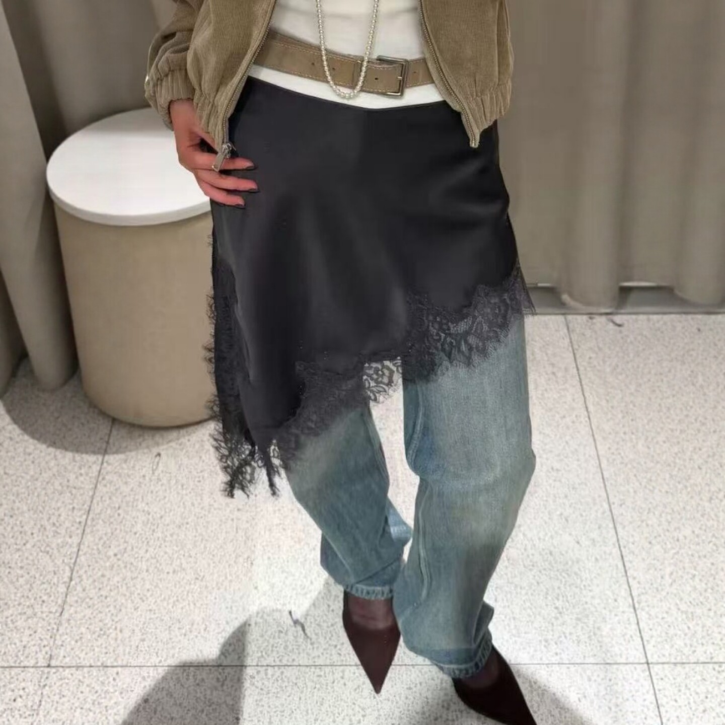 丝缎质感抗皱不对称蕾丝半身裙
