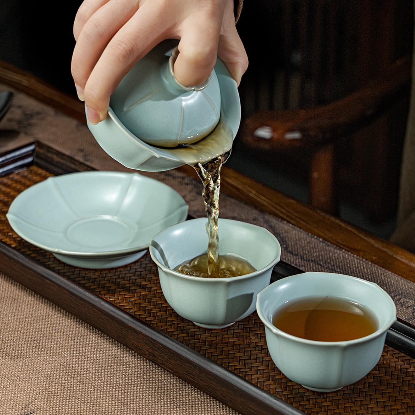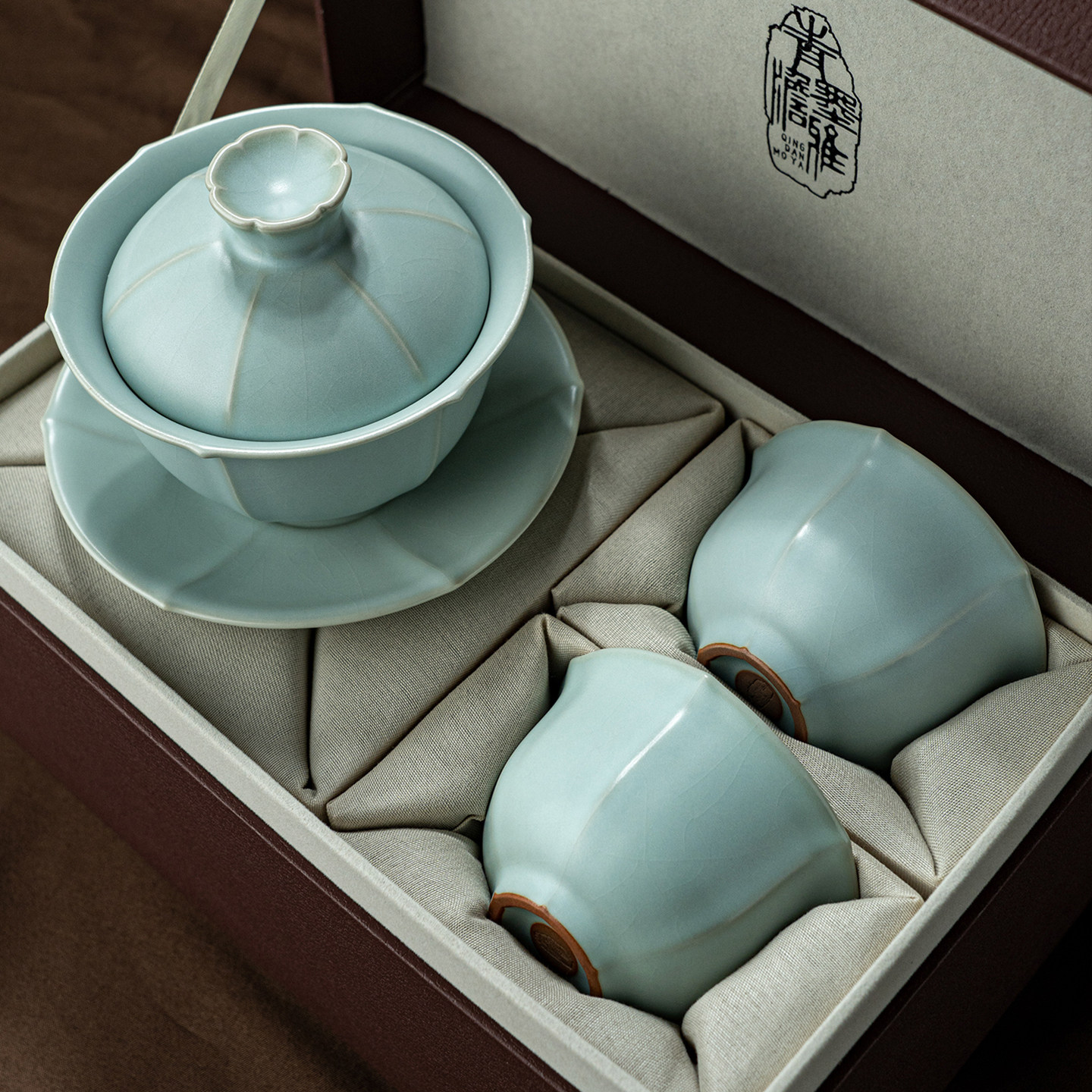 汝窑三才盖碗茶杯套装泡茶碗景德镇汝瓷功夫茶具复古青瓷礼盒装
