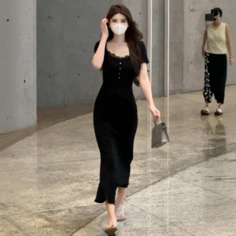法式赫本风御姐包臀长裙女夏新款修身显瘦方领蕾丝拼接气质连衣裙