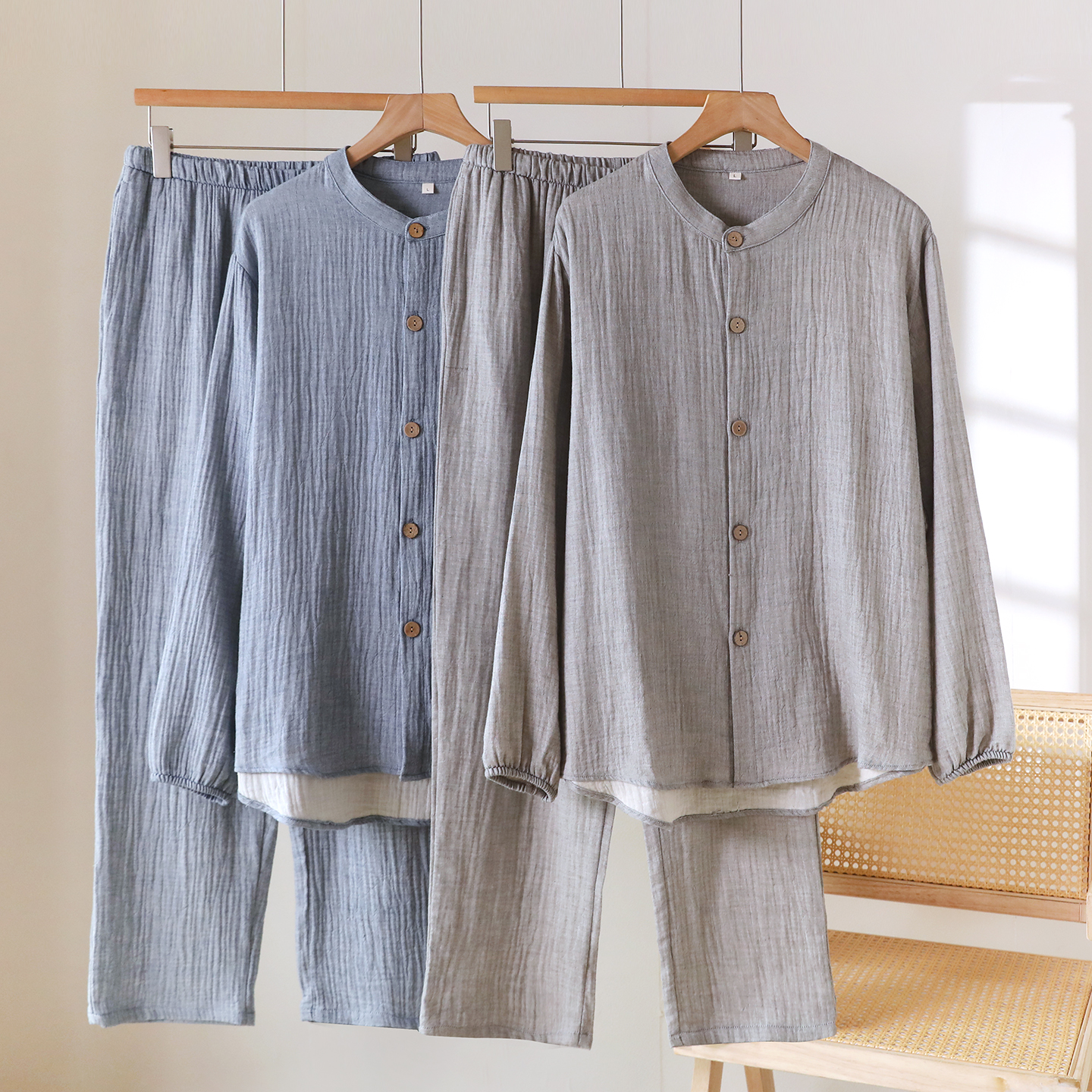 新款无领中式纯棉男士睡衣长袖春秋薄亚麻纯色开衫休闲家居服套装
