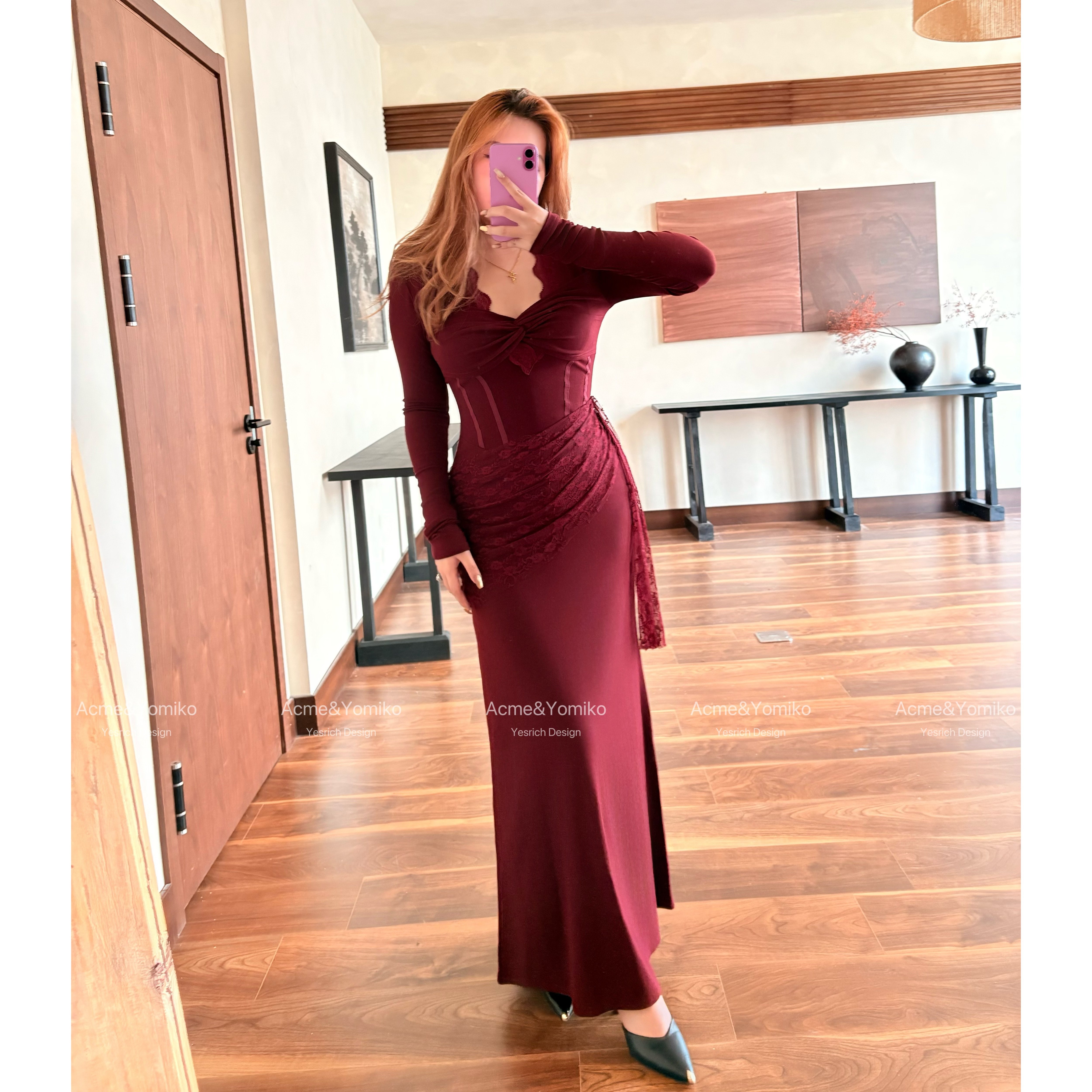 惊鸿茶叙 法式优雅性感风蕾丝拼接设计扭结深V领连衣裙G332/G360