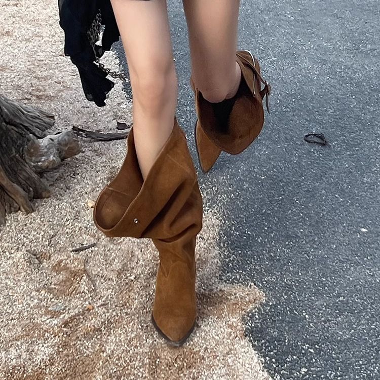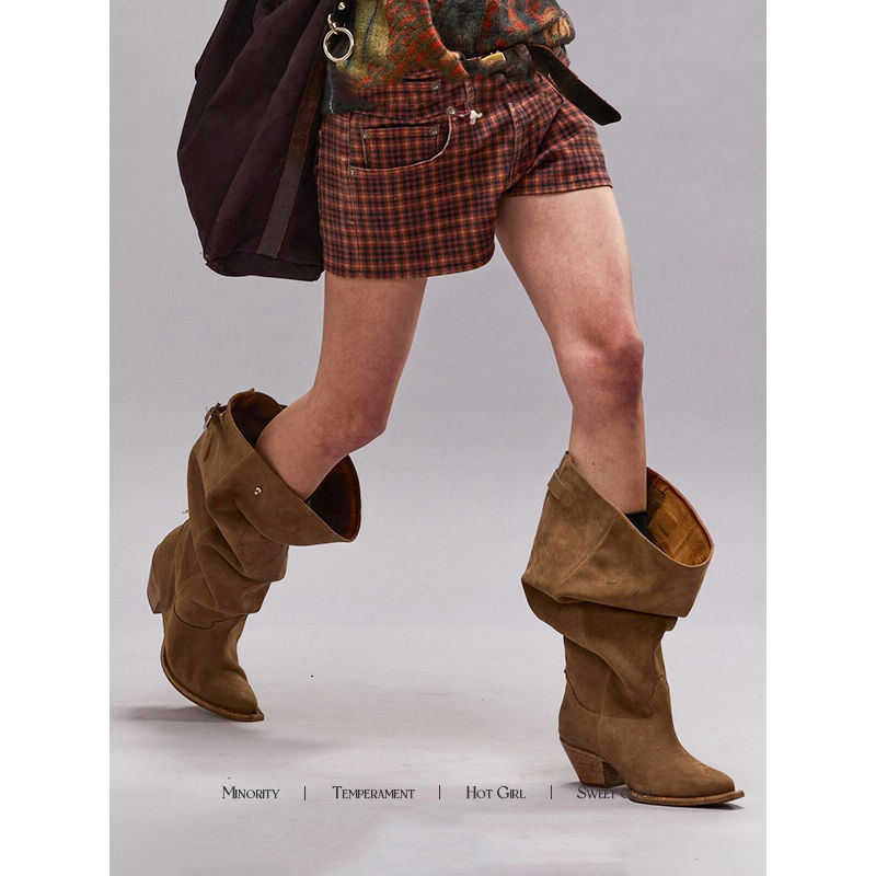R高筒美式西部牛仔靴大筒围堆堆靴增高复古尖头骑士靴女粗跟