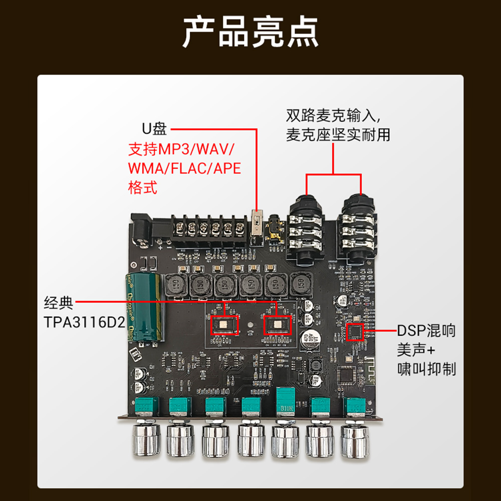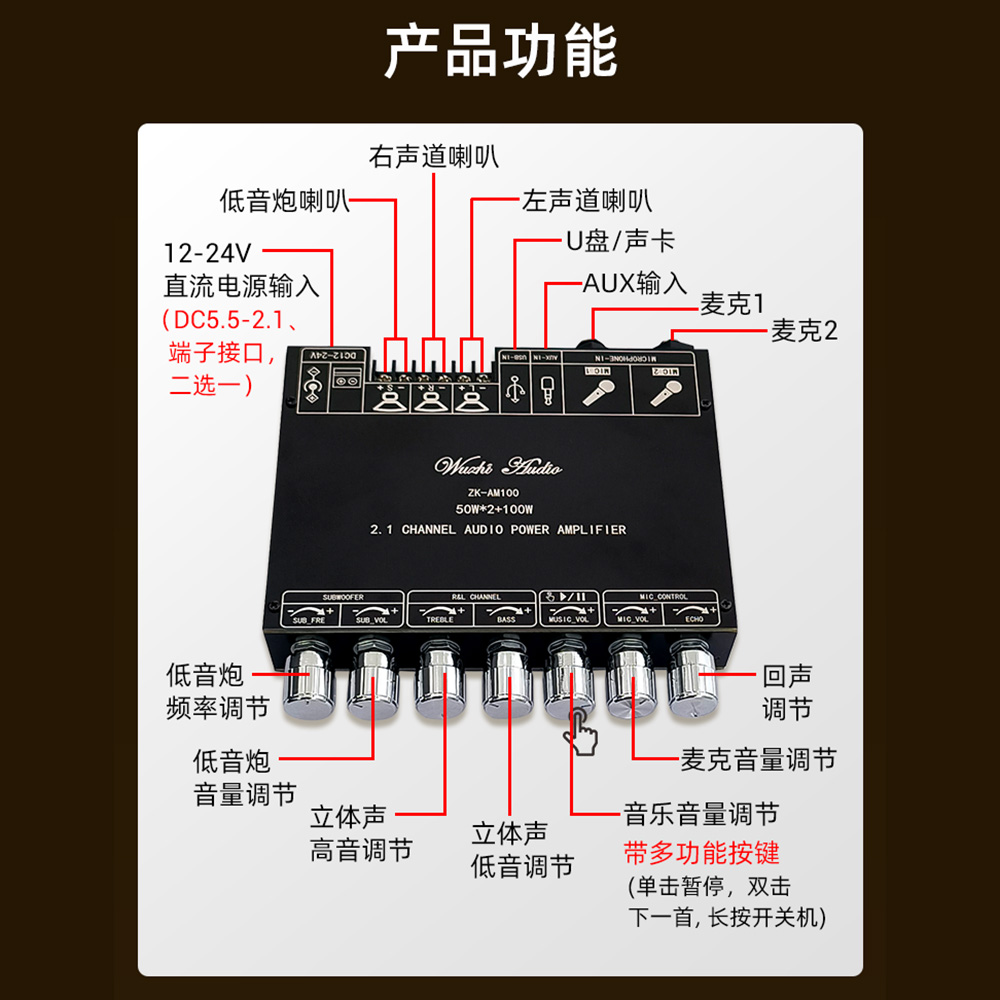 ZK-AM100大功率KTV话筒音响一体机2.1声道蓝牙功放板50+50+100W
