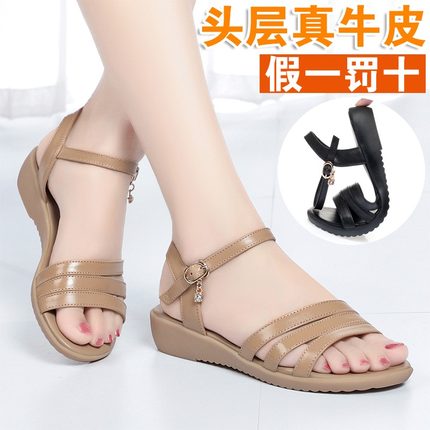 夏季坡跟平底舒适软底中老年妈妈凉鞋女士真皮凉鞋女式凉皮鞋鱼嘴
